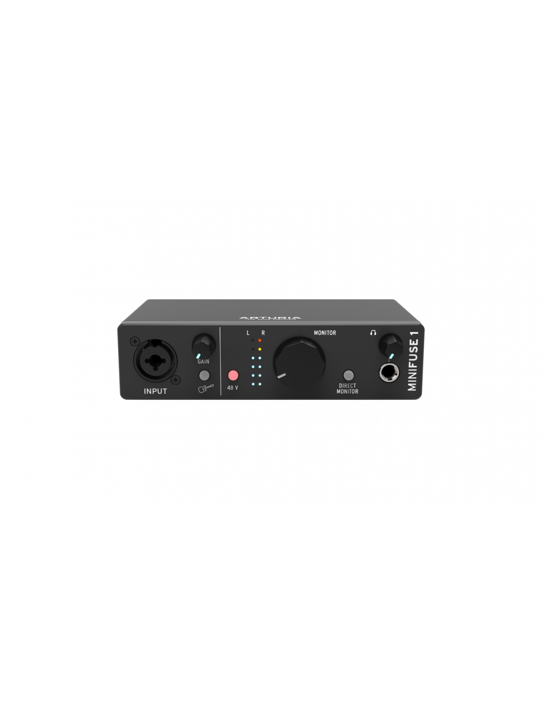 USB C Audio Interface 1 In Combo and 2 Out Nera Arturia presents the new range of portable and compact audio interfaces MiniFuse, which goes hand in hand with the award-winning AudioFuse series; the new MiniFuse range consists of three models accessible to everyone and with respectable features. The new MiniFuse range, consisting of the three MiniFuse 1, MiniFuse 2 and MiniFuse 4 models available in double black and white colors, derives from the Arturia AudioFuse series of audio interfaces and includes many of the features of the 'major' series, with also new unique and very interesting implementations. All interfaces are Class Compliant & Bus Powered, which means that you can connect them and start working immediately, without having to use an external power supply. Recording and producing has never been easier. Arturia MiniFuse 1 includes an input and two audio outputs, MiniFuse 2 also introduces MIDI connections and integrates two audio inputs and two audio outputs, MiniFuse 4 includes MIDI connections and four audio inputs and four audio outputs. The new solutions of the French company are perfect for recording voice, guitar, podcasts and for producing tracks with the highest quality, also with a rich and complete software package. The miniFuse interfaces fit perfectly into a standard configuration for studio or live production, with a simple set of inputs and outputs. The combo inputs allow you to easily connect XLR or 1/4" jack connectors, while the connection to the computer (PC or Mac) is guaranteed by the USB-C connection. In addition, thanks to an additional USB hub port, it is possible to connect additional USB devices such as a possible MIDI keyboard. The miniFuse interfaces offer a dynamic range and equivalent first-level input noise typical of high-end professional interfaces: an important legacy guaranteed by the developers of the AudioFuse series. The result is optimal sound performance: respectable dynamics with a clear, noise-free signal. Minifuse is not only compact and lightweight: its sturdy aluminum enclosure is perfect for the manufacturer's “on the road” lifestyle. Put it in your bag, go out and find the sound you were looking for. Whether you are using a laptop or a desktop, MiniFuse can work in any configuration on both PC and Mac, connect it and experience total freedom of registration. Then through the special MiniFuse Control Center application, it is possible to control inputs, outputs, settings and firmware updates, all from a single app. With the included software, always keep your creativity and inspiration alive with tutorials for music production, advice on mixing and Ableton project models created by artists, producers and beatmakers. The free software is constantly updated and does not require any additional subscription.Arturia FX: Perfect your sound with 4 premium effect plugins, classic studio outboard emulations: a plate reverb, an analog preamplifier, an echo tape and a stereo chorus.Ableton Live Lite: Compose, record, perform and produce any song with the introductory version of one of the most popular musical software in the world.Analog Lab Intro: Easily add sounds inspired by award-winning keyboard and synthesizer emulations to your mix Arturia: hundreds of presets to explore, from vintage synths from the 80s to modern sounds.Auto-tune Unlimited - Free 3-month subscription: Perfect your vocal parts for perfect harmony or switch to Autotune in full trap style with a 3-month subscription for the most used vocal optimization plugin in the industry.Guitar Rig 6 LE: A selection of amplifiers, cabinets, delays, reverbs, stompboxes and compressors, so you can build your own effect chains and customize the perfect guitar sounds.Splice Creator Plan - Free 3-month subscription: Access millions of samples and plug-in presets, from lo-fi drum loops to punchy vocal one-shots, and add them to your personal collection for your productions.Main features MiniFuse seriesCombo XLR/1/4" jack inputs to connect microphone or instrumentBacklit controls: MiniFuse knobs light up in response to touch, turning red when the signal is too highGain control: adjust the level of the microphone or connected instrumentInstrument level switch: Switch between line signal and instrument for a clear and consistent signalMonitor level control to adjust the main output volume48V phantom power switch - MiniFuse can provide special extra power to the microphones that need itHeadphone output with connection via 1/4” jack Headphone level control to adjust the output volumeUSB-C connection USB-A hub connection to connect any additional standard USB devicesOutput monitor left and rightFull software package