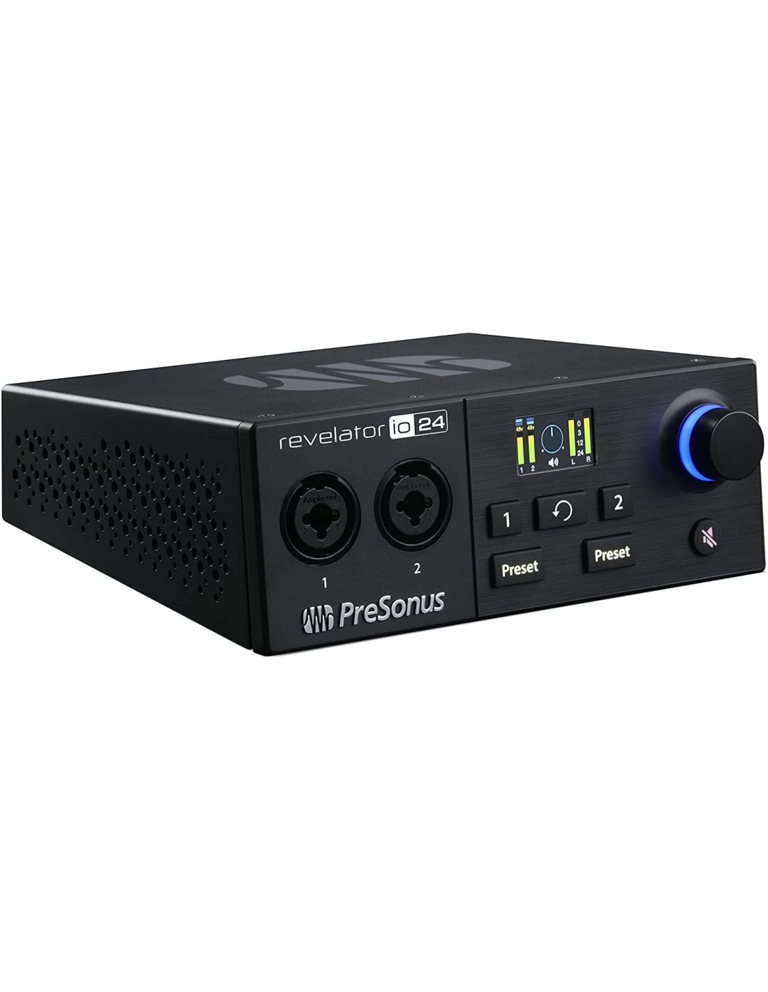 The Revelator io24 is a Presonus USB-C audio interface with mixer and effects, designed for recording and streaming. It features 6 inputs and 8 outputs, 2 XLR combo jack inputs with XMAX-L microphone preamps, built-in loopback mixer, and custom presets for voice, guitar, and more. It includes Studio One Artist and Studio Magic software.