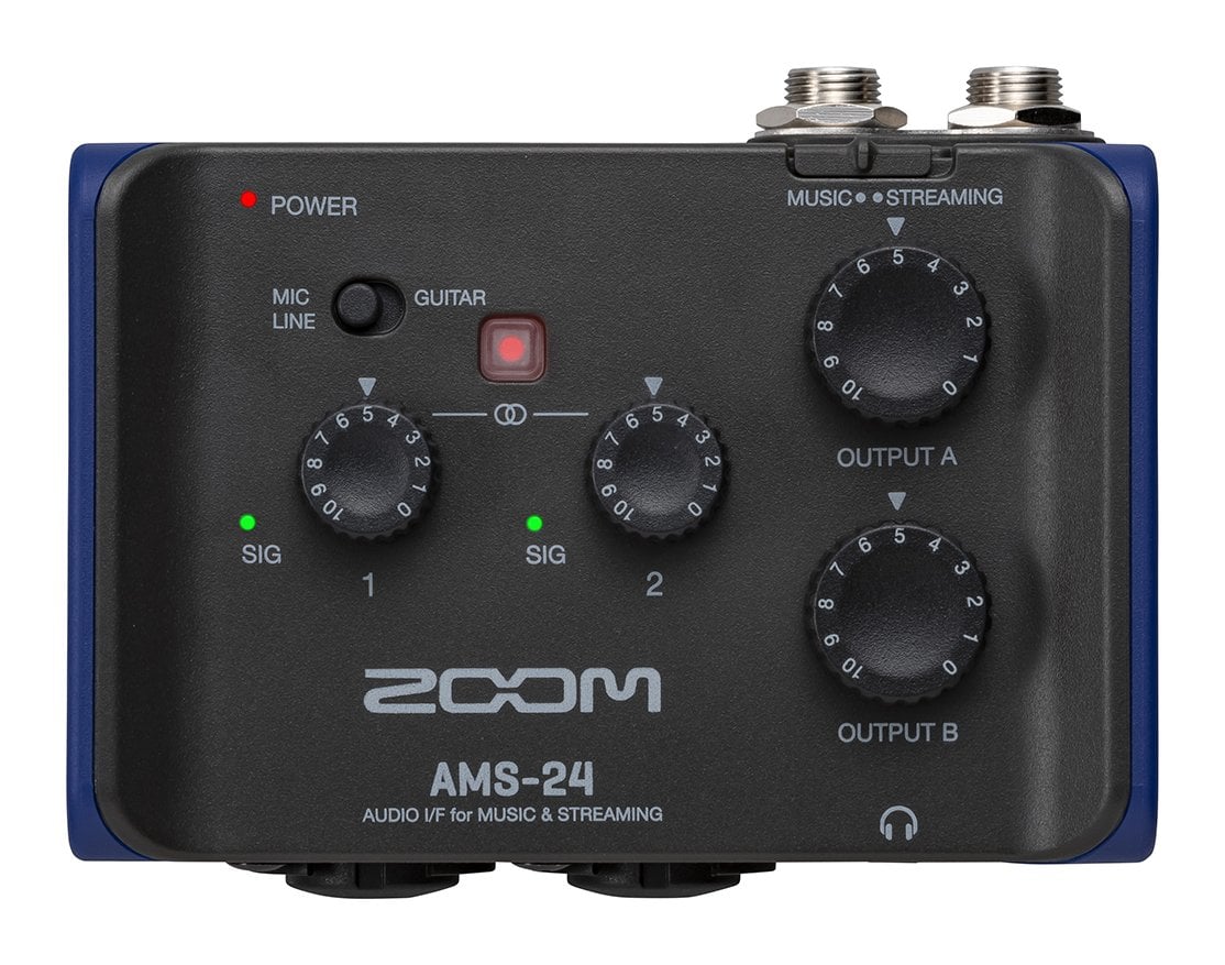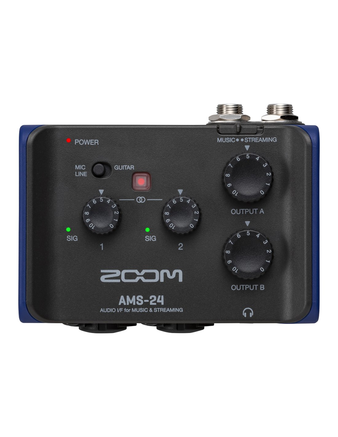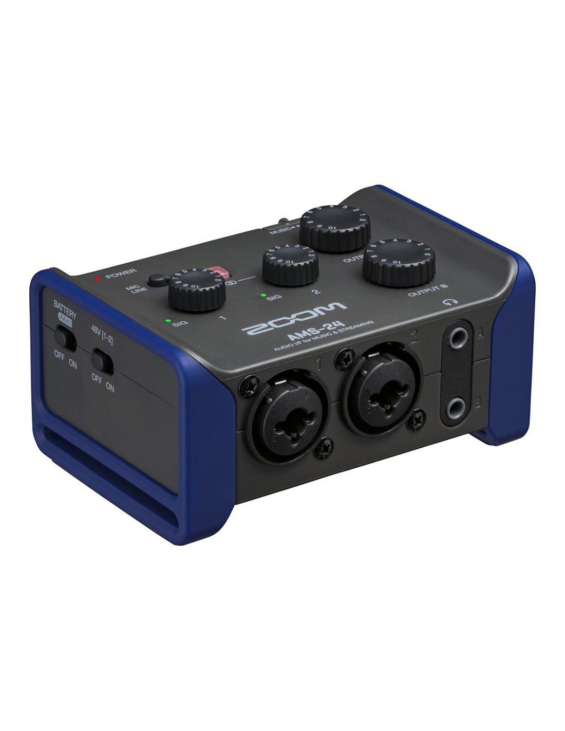 Zoom Ams-24 is a 2in/4out USB-C audio interface for audio recording and streaming. Technical features include 2 XLR/TRS combo Mic/Guitar inputs with HI-Z instrument selector, 2 stereo 3.5mm jack headphone outputs, and 2 TRS jack outputs. It has a 24-bit resolution (44.1kHz, 48kHz, 88.2kHz, 96kHz), +48v Phantom power, loopback selector through a dedicated switch, music/streaming selector. The audio interface is compatible with Windows, Mac, iOS and Android and can be powered via USB-C bus or 2 AA batteries not included