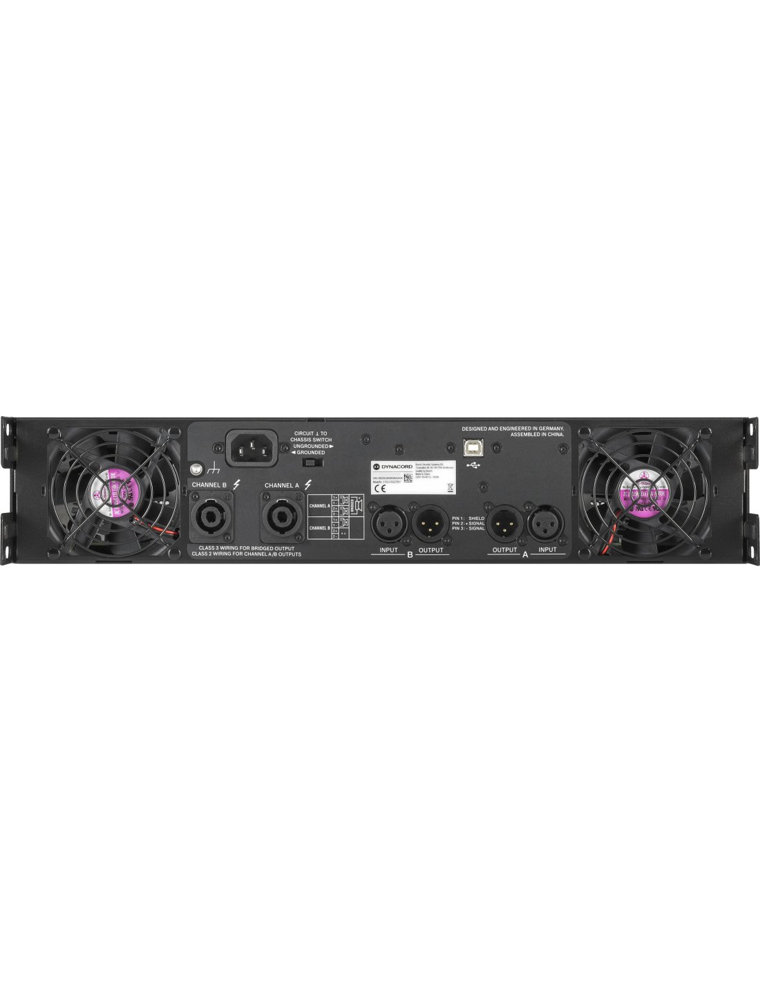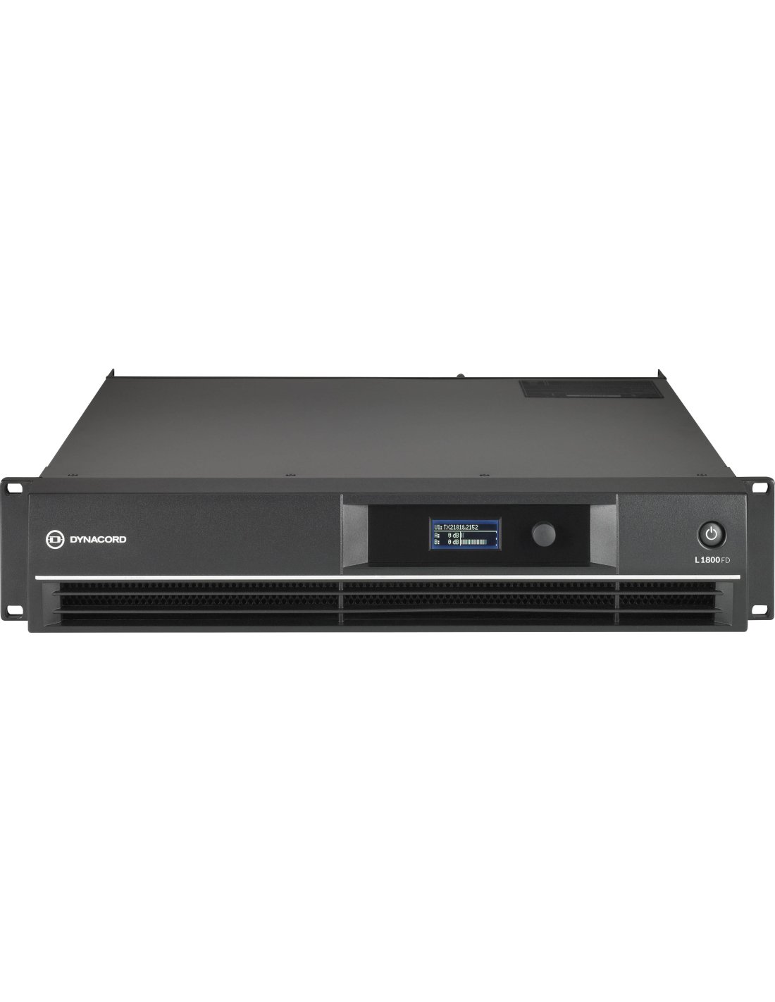 2-channel power amplifier with DSP, FIR filters, limiters, delays, GEQ and PEQ per channel. Class AB topology. Output power in stereo mode (THD 1%, 1kHz): 2x 480W at 8, 2x 950W at 4, 2x 1600W at 2. Bridge-mode output power (THD 1%, 1kHz): 1x 1700W at 8, 1x 2800W at 4. Frequency response: 10Hz to 21kHz (±1dB). Gain: 32 dB. Input sensitivity: +21dBu. Maximum RMS output voltage range: 65.1 V. Power consumption at 4 at maximum output power: 700W. LED display Gain and indicators (LEDs) for output level, limiter, protection and power supply on the front. Protection circuits for: overheating, overload, short circuit, EMF return, peak current, inrush current, HF and DC output and soft start. Signal input/output via XLR3. Load output with Speakon connector. Dimensions (W x H x D), mm: 483 (19') x 88 (2U) x 462.4. Weight: 15.2 kg