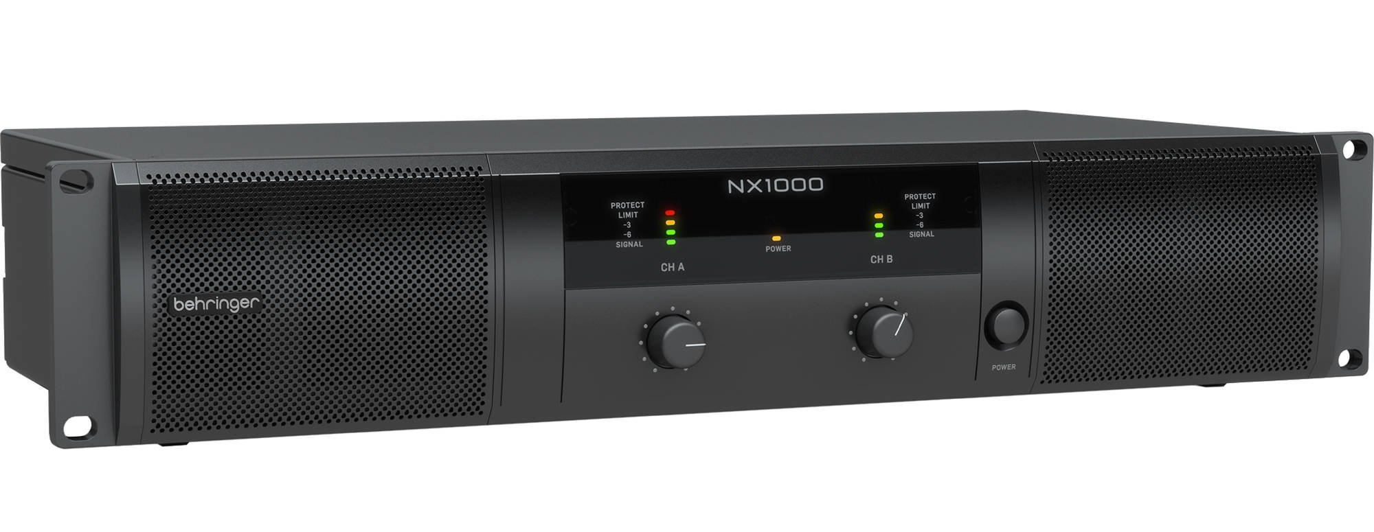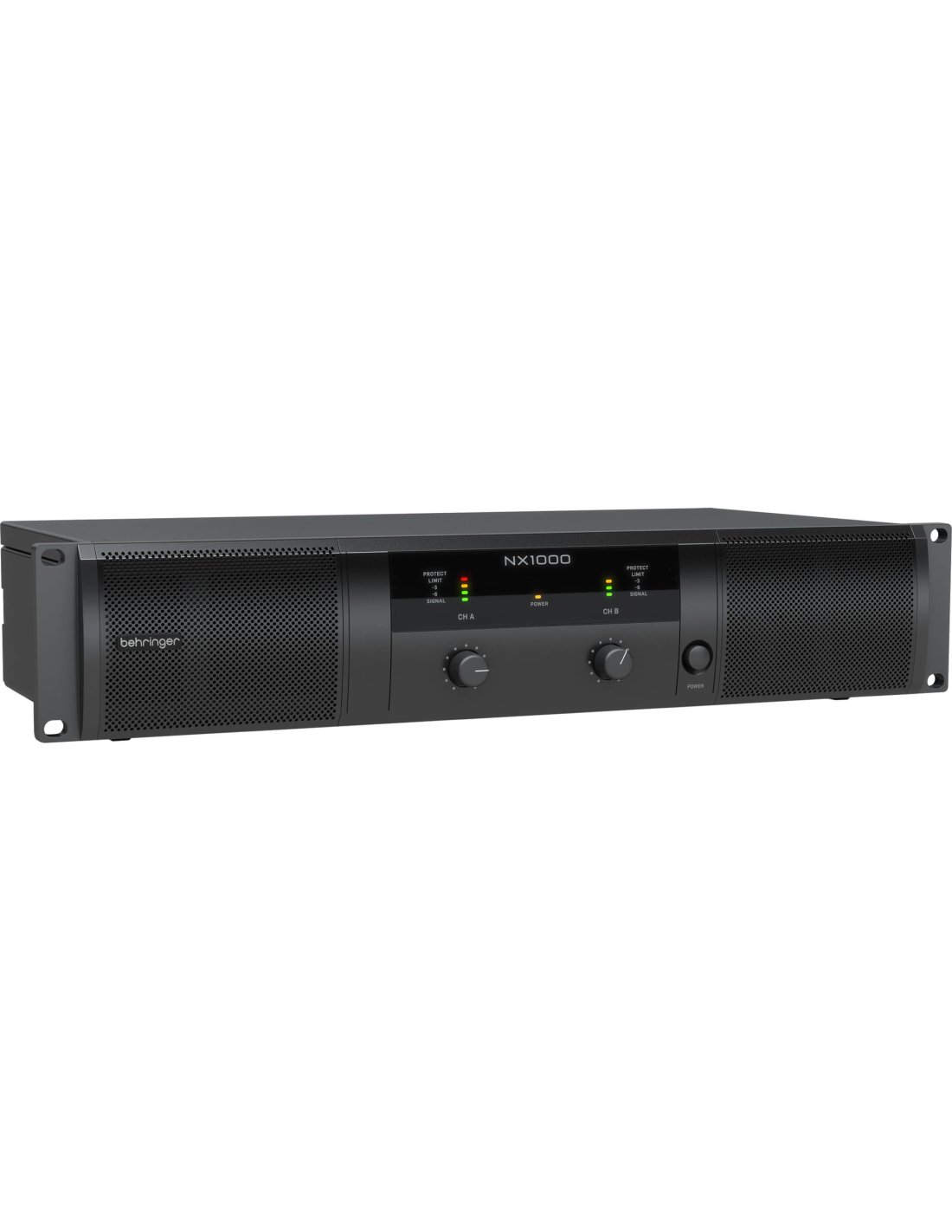BEHRINGER NX1000 POWER AMPLIFIER is a power amplifier with automatic impedance control and 1000W class D at 4 Ohms in mono-bridge mode, 2x 300W at 4 Ohms and 2x 500W at 2 Ohms. Technical features include rack mounting, Gain controls for both channels on the front panel and LCD with 5 Limiter sections for monitoring, built-in stereo crossover, limiter with Zero Attack technology. It features XLR/TRS combo inputs