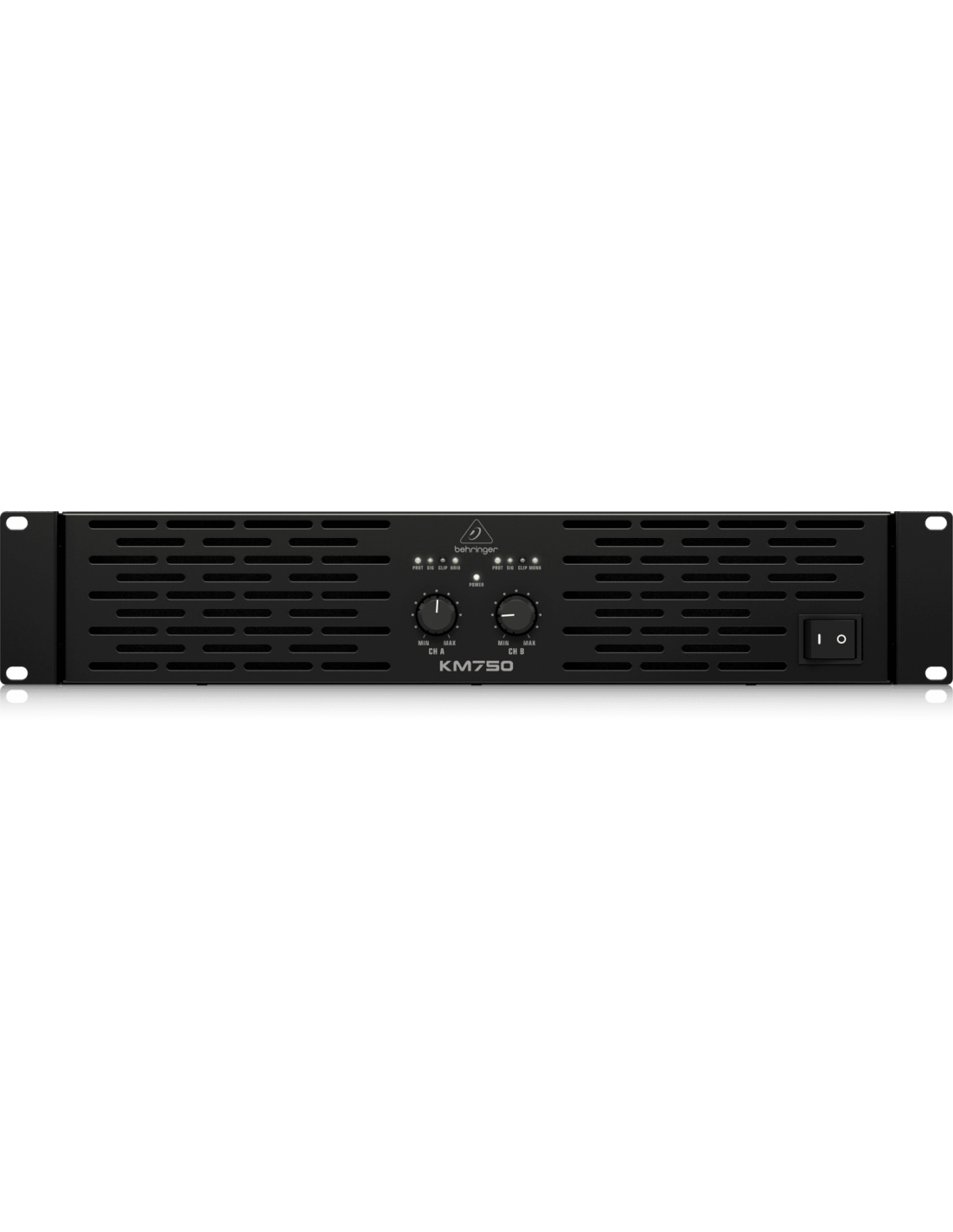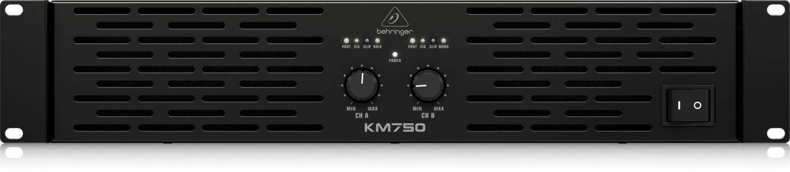 BEHRINGER KM750 POWER AMPLIFIER is a 750W 8 Ohm mono-bridge power amplifier, 2x 200W at 8 Ohms, 2x 400W at 4 Ohms. It features Behringer Transient Response Accelerated (ATR) technology for punch and clarity of sound, signal indicator and LED clip with knob gain controls, 2 balanced XLR inputs and TRS with ground lift switch and activatable limiter, 2 Speakon outputs, overload protection technology on each channel, double “Front to back” cooling