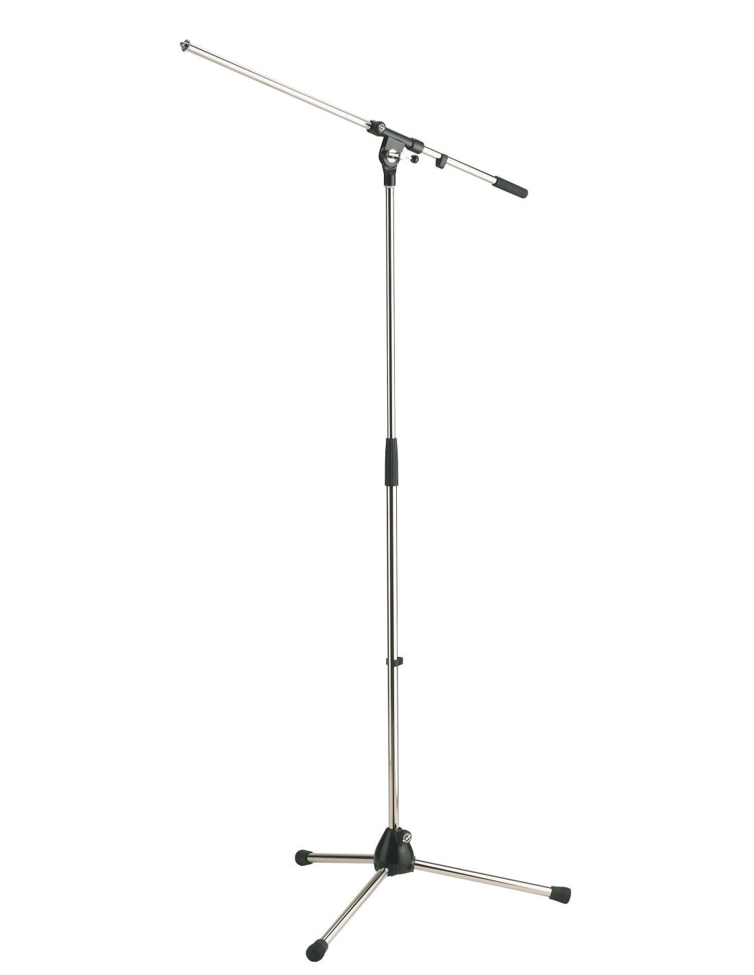KONIG & MEYER 21020-300-01 is a chrome-plated giraffe microphone stand with foldable tripod base, height adjustment with torsion clamp, chromed steel frame, clamp with T-lock screw, compatible with all microphone clips.