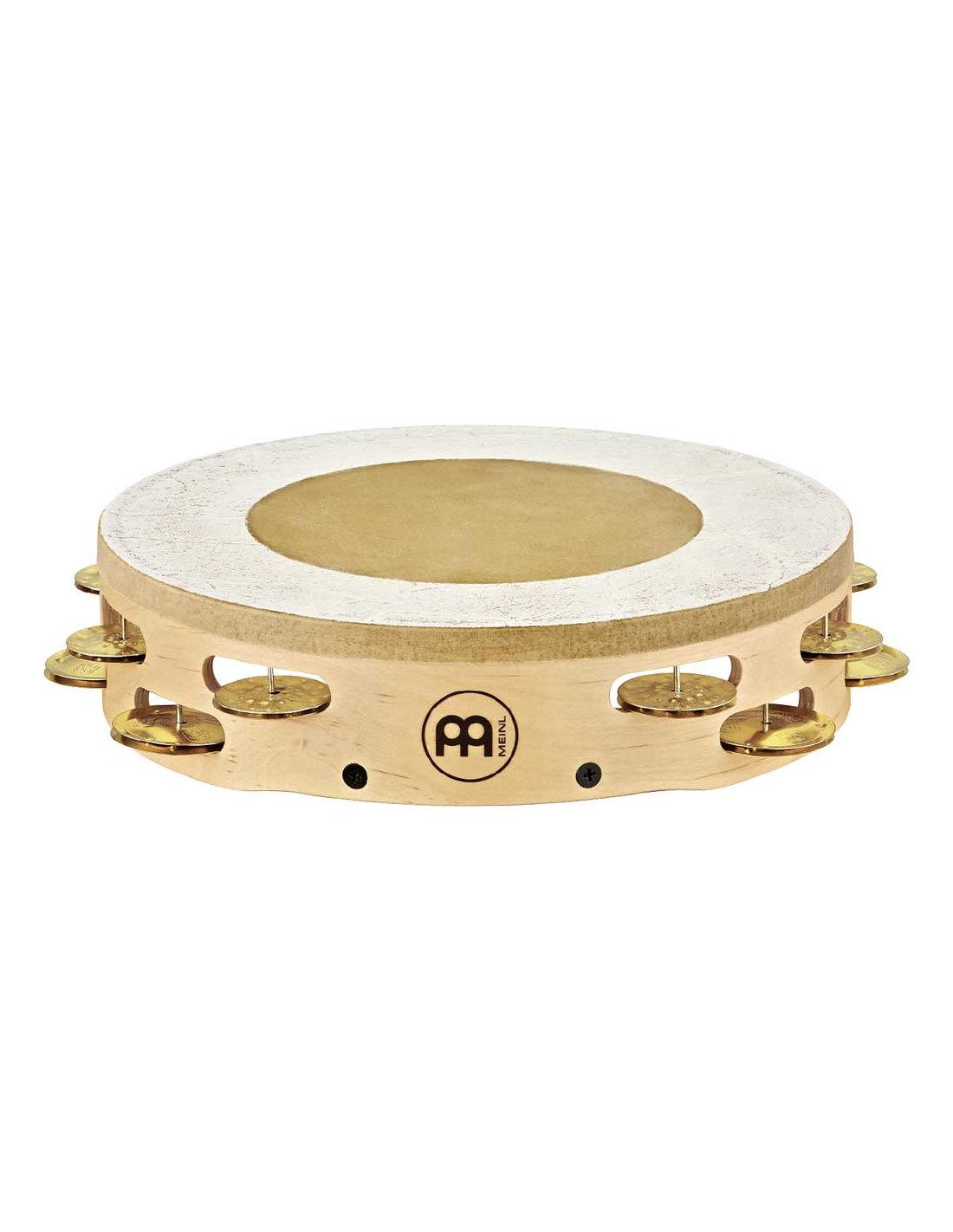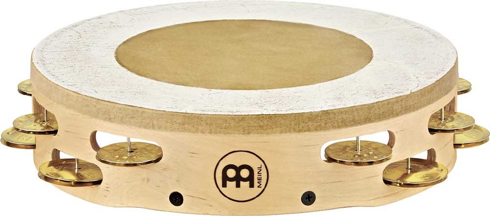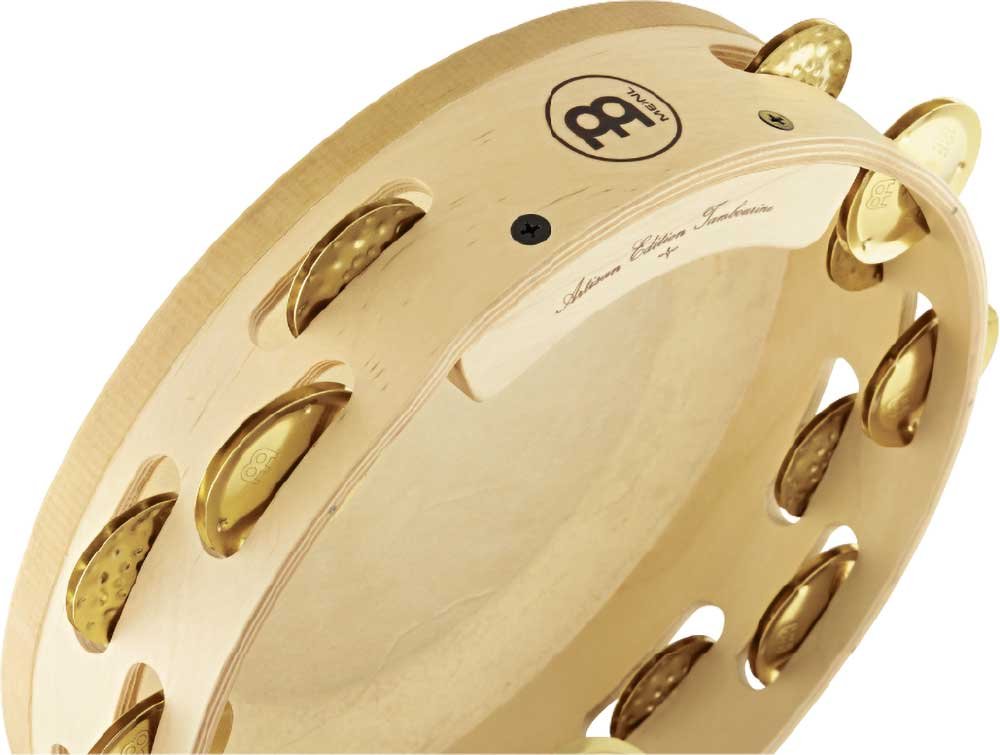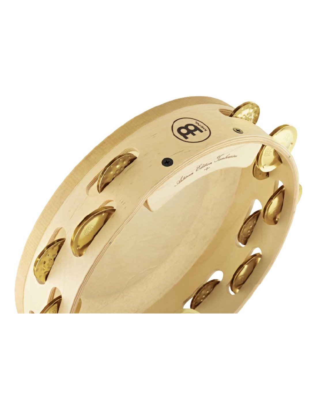 'Artisan Edition tambourine with natural head and 2 rows of brass rattles. The Artisan Edition tambourines have the best possible structure and finishes. The leather heads are selected one by one and are also polished on the outside to ensure two contact surfaces on the same head. The shells are made of American ash and the rattles are hand finished and all have our logo imprinted on them.