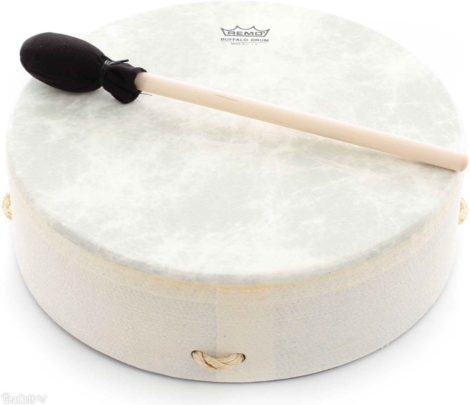 REMO E1-0314 BUFFALO DRUM is a short barrel drum inspired by the indigenous tribes of the Americas, made with an Acousticon barrel, 14" pre-tuned Remo Fiberskyn 3 leather with rough coating with Reemlar lamination, taut transverse strings for manual support. It includes a door leaf.