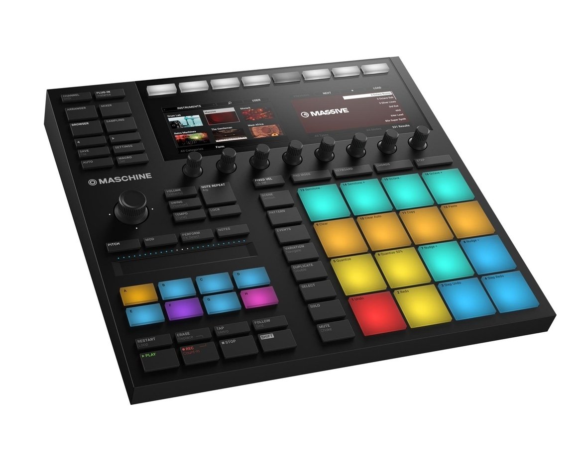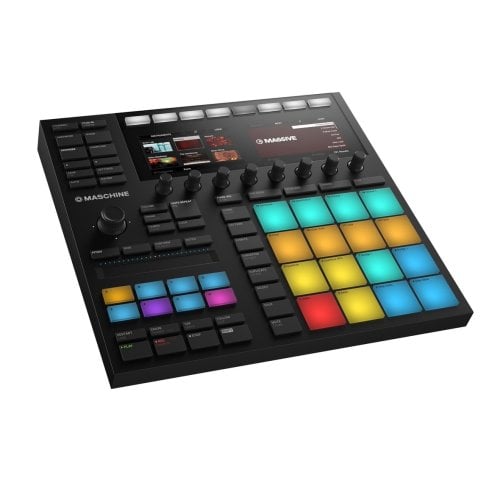 NATIVE INSTRUMENTS MK III MACHINE. Groove Box for music production with integrated 24-bit/96kHz audio interface, 2 high-resolution displays for viewing and editing sounds, samples and tracks, 16 large backlit Performance Pads, 4-way push encoder for easy navigation, 47 buttons and 9 rotary encoders for reproduction, recording, sequencing, automation and sorting without a monitor, Smart Strip for strumming, pitch-bend, FX, step sequencing, real-time recording, note repeat slicing and auto-mapping, sampler of digital effects with Hands-on control, Automation recording and Step automation editing functionality, drag-and-drop sample export, dedicated MIDI mapping software, MIDI I/O