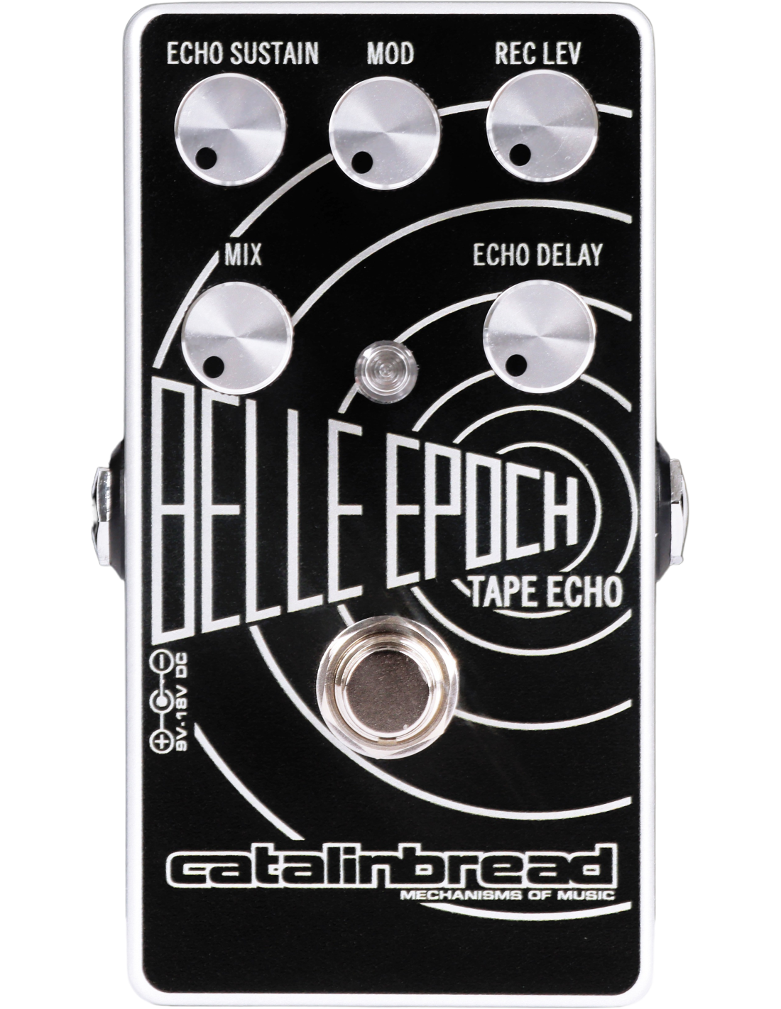 The Belle Epoch Black On Silver is a ribbon echo effect for guitar and bass by Catalinbread, inspired by the famous Maestro Echoplex EP-3. It features controls for recording level, wow, flutter, and repeat decay, and internal switch for true bypass or trails mode