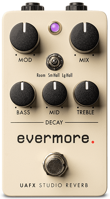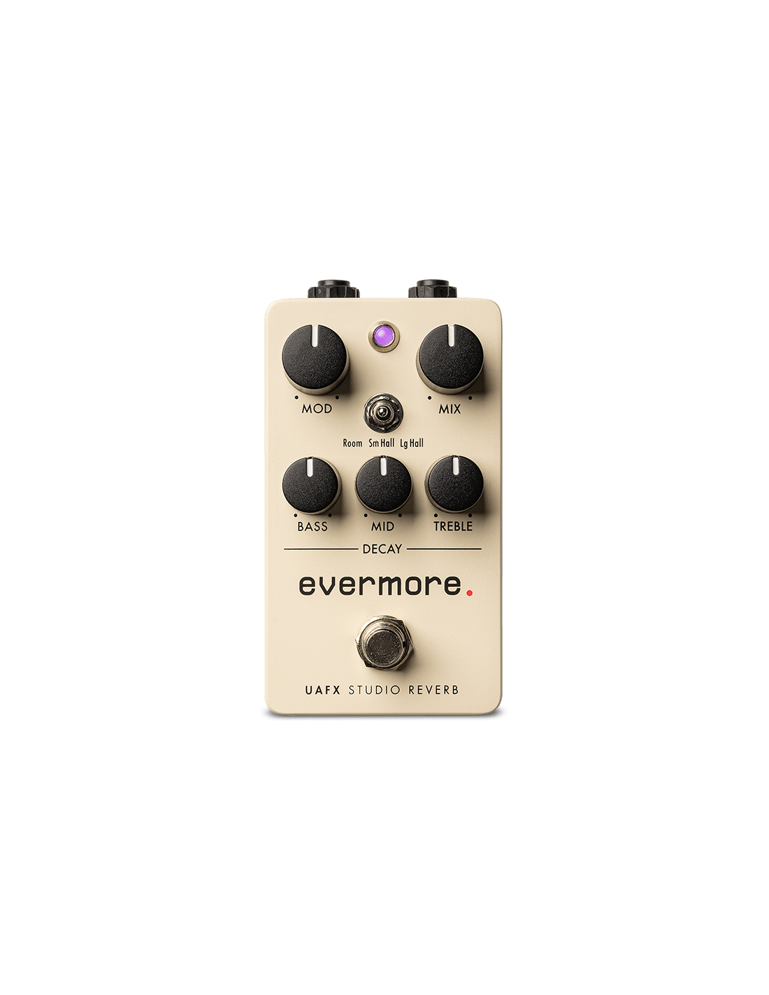 UNIVERSAL AUDIO UAFX EVERMORE STUDIO REVERB. Digital reverb effect on guitar pedal developed on the Golden Riverberator pedal algorithms, with 3 reverb effects selectable via switch: Room, Small Room and Large Hall, Mod, Mix controls, Decay Bass, Mid and Treble adjustment, Bypass selectable between True and Trails and Predelay On/Off switch. It has unbalanced TS input and output via 1/4 jack and USB-C output for firmware updates. It works with 9v power supply sold separately.