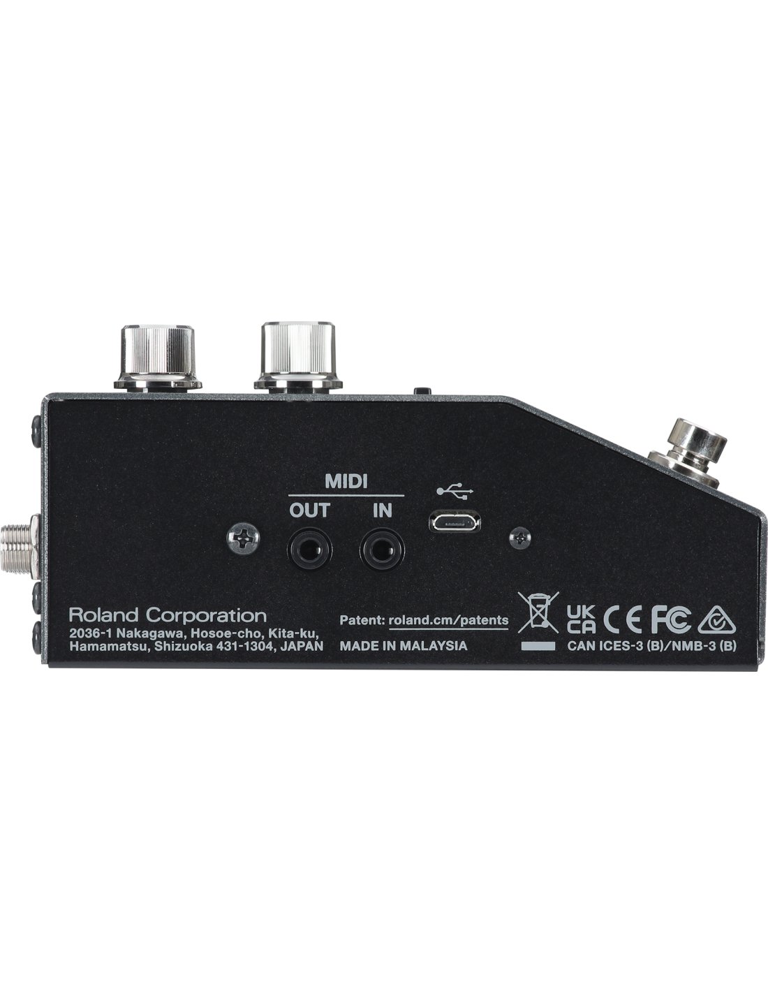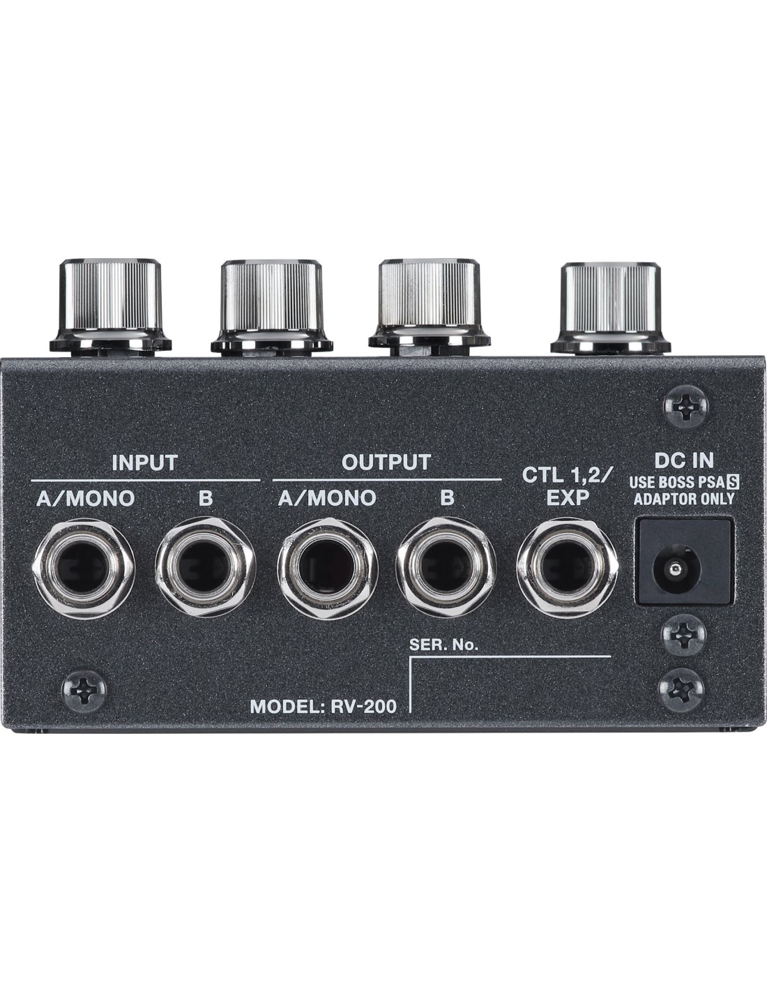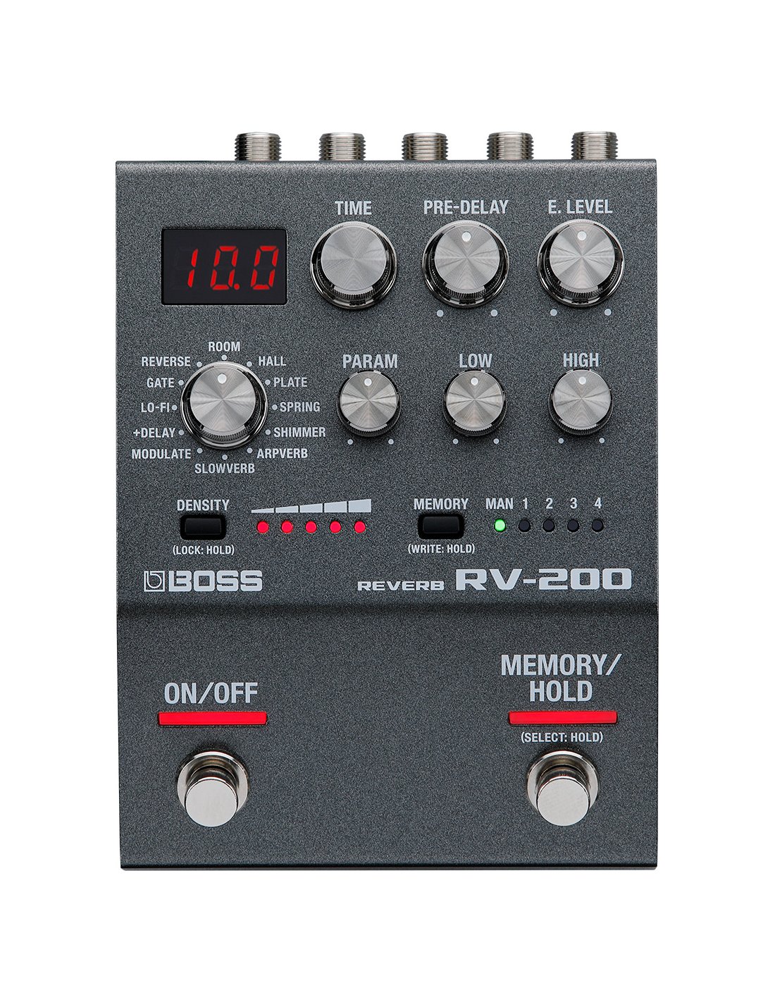 BOSS RV-200. Digital reverb pedal for guitar and instruments with 32-bit AD/DA conversion, 32-bit floating point processing and 96 kHz sample rate, 12 selectable reverb sounds, 127 memory slots available, 6-stage Density control, Param knob to change the parameters of each selected reverb, Carryover function. It features stereo input and output with wet/dry and dry mute output options, Hold, Warp and Twist effects available through foot switch control, extended external control through foot switches, expression pedal and MIDI TRS input/output