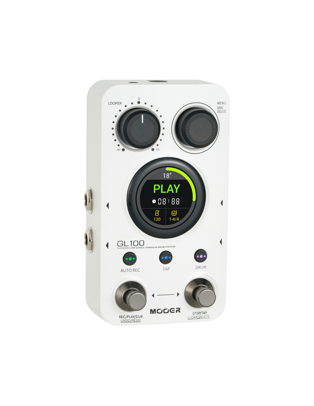 Stereo Loop Station & Drum Machine<br /><br />• 300-minute capacity stereo phrase looper<br />• 100 storage positions<br />• Two multi-purpose footswitches, both with a complex selection of control combinations<br />• Circular, 1.3-inch touch screen for status display and convenient function control<br />• Drum machine including 11 variations of 20 different drum pattern styles in various time signatures<br />• Built-in quantization function for perfect synchronization with phrase loops<br />• Time stretch function<br />• Tap tempo BPM support<br />• Auto-record function with adjustable signal threshold<br />• Automatic and manual state-saving <br />• Real-time loop browsing for arrangements during performances<br />• Loop overdubbing, cancellation, undo and redo<br />• Count-in feature <br />• Drum machine synchronization, with four stop modes<br />• MOOER’s AI Band Technology, which automatically matches drum patterns with real-time guitar input.<br />• Flexible input/output mode selection, including stereo, dual-mono, and isolated signal processing<br />• Dedicated PC software for importing and exporting audio files, data management, and firmware updates <br />• 2 x 1/4" mono input and output jacks<br />• 1 x 1/8" stereo headphone jack<br />• Sample rate: 44.1kHz<br />• Sample depth: 24 bit<br />• Export file format: .wav<br />• 9V 300mA power supply (included)<br />• Weight: 200g