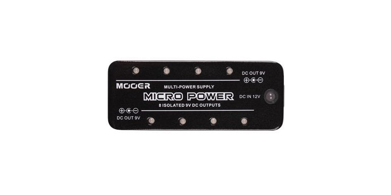 Mooer Micro Power Supply pedal power supply. The Mooer Micro Power Supply is a stabilized 9V DC power supply for pedals with 8 independent well-isolated, high-performance and silent 300mA outputs. It has 8 LEDs that indicate the activation or shutdown of the power supply outputs. Includes 12v power supply.