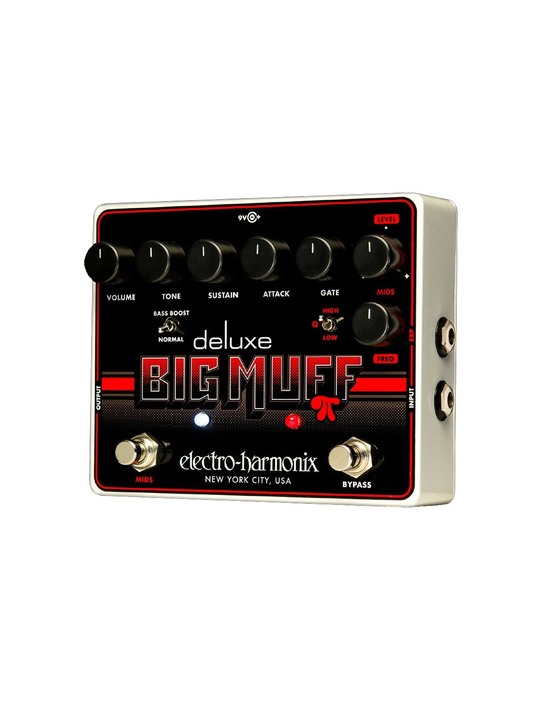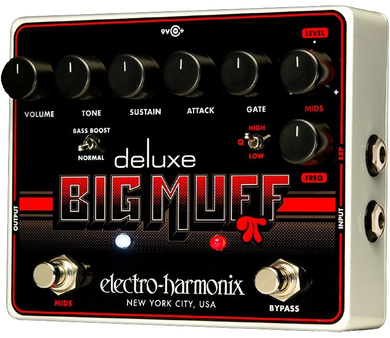 Electro Harmonix Deluxe Big Muff Pi Guitar Pedal. The Electro Harmonix Deluxe Big Muff Pi is a distortion/sustainer pedal for true bypass guitar. It is equipped with the Volume, Tone, Sustain, Attack, Gate, Mids Level, Mids Freq controls, the Bass Boost/Normal mini switch and the Mids High/Q/Low mini switch. Two foot switches allow you to activate the big muff and the mids section. It has the Expression Pedal input for real-time midrange control.