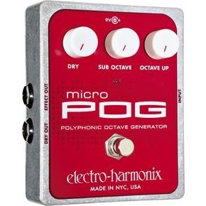 Electro Harmonix Micro Pog Guitar Pedal. The Electro Harmonix Micro Pog is a polyphonic octave generator pedal for guitar, a reduced version of its older brother Pog. It can generate 12-string bass, organ and guitar sounds. It is equipped with the Dry, Sub Octave, Octave Up controls
