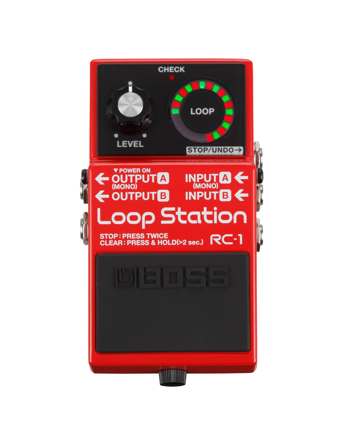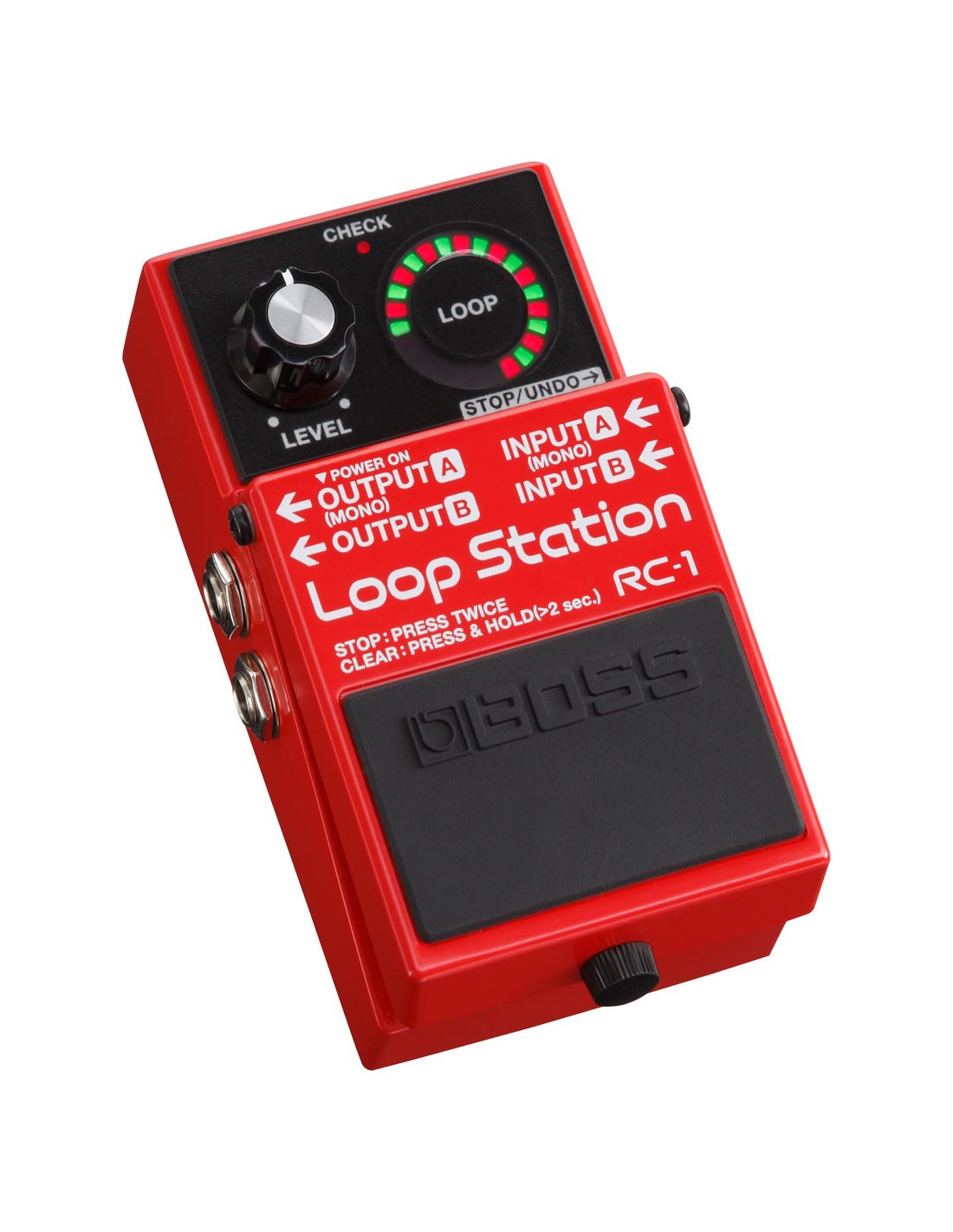 BOSS RC-1 is a single-track guitar Loop Station pedal that offers the ability to loop a single track with recording, undo/redo and Overdub functions. It has a new display with 24 circularly arranged LED segments, level control encoder, 12 minutes of continuous recording. It has inputs and outputs via TRS jack and slots for external control. It is powered by a 9v battery or external power adapter not supplied