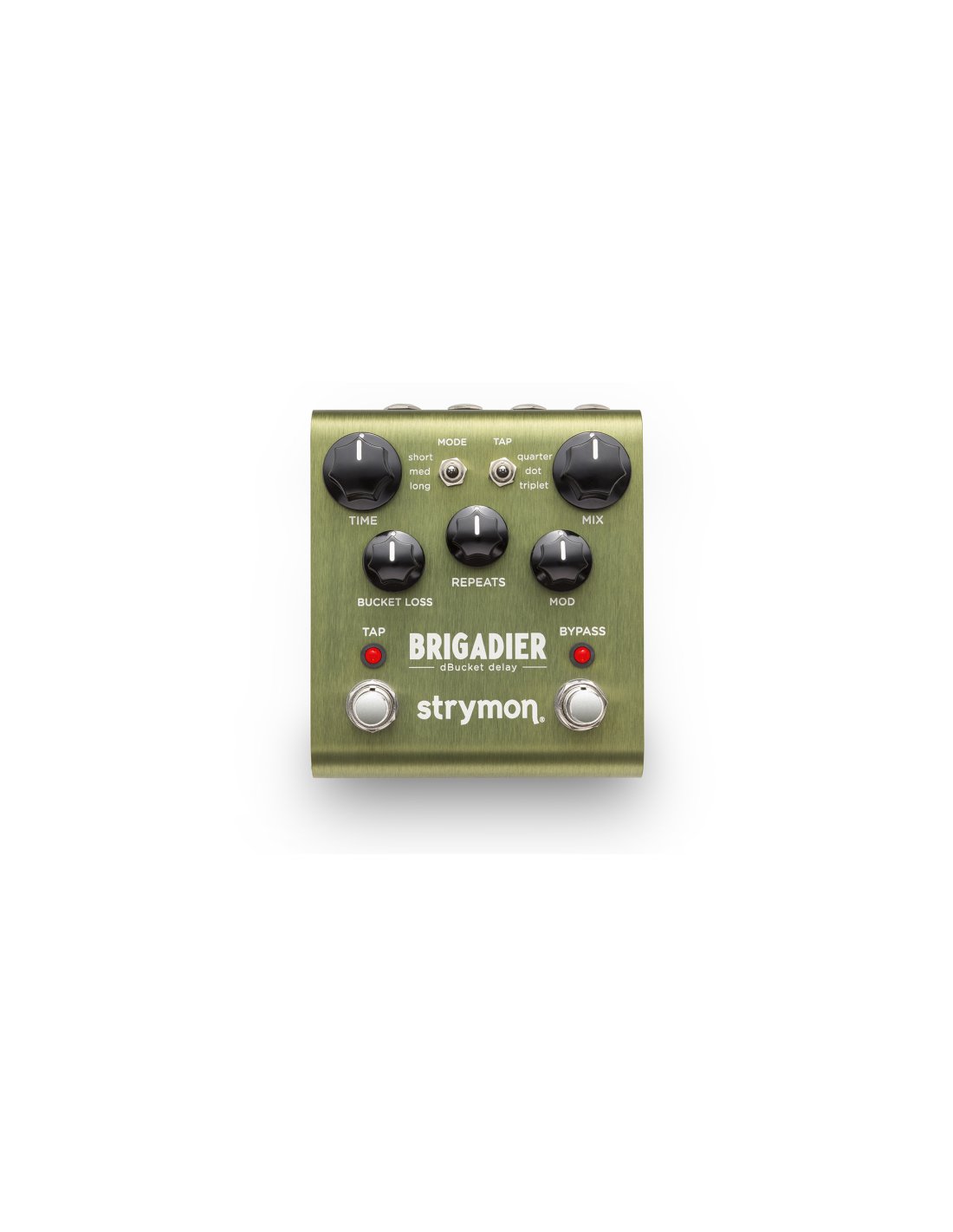 The Strymon Brigadier DBucket Delay is a digital guitar pedal delay that features the SHARC DSP to reproduce an analog delay in every detail. It is equipped with Time, Mix, Bucket Loss, Repeats, Mod controls and two 3-position mini switches to select the Short/Med/Long delay modes and the Quarter/Dot/Triplet tap tempo modes. Two foot switches allow you to activate the Tap and Bypass functions