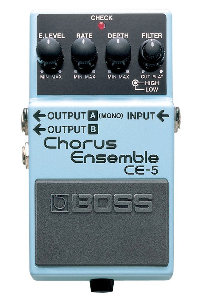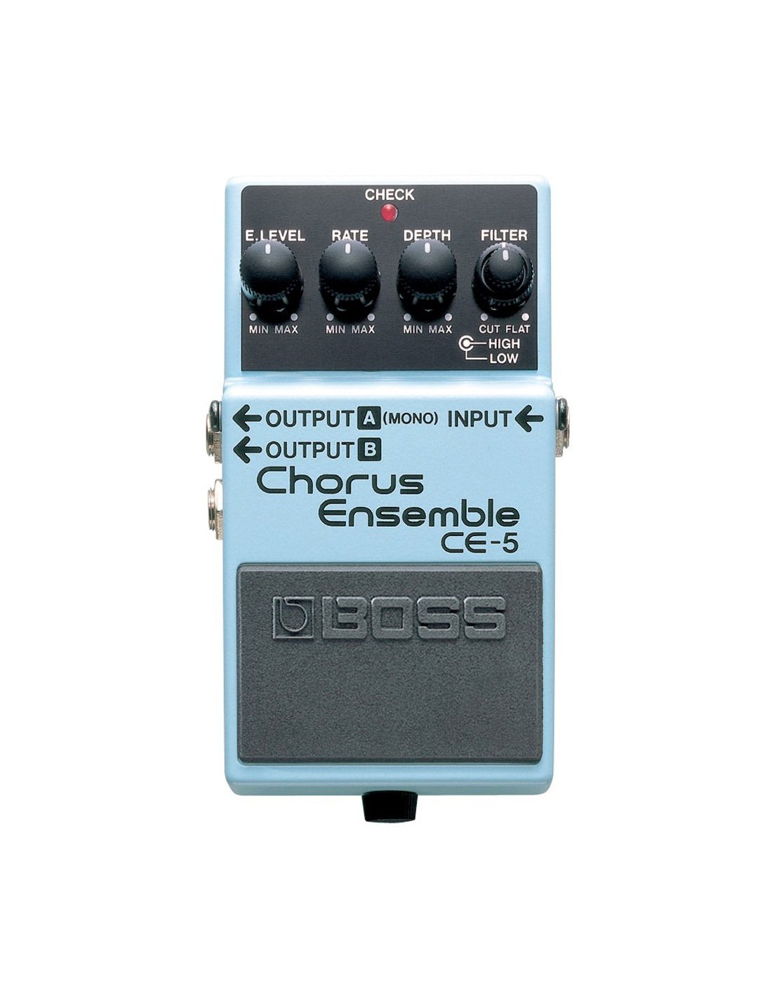 Boss CE5 Chorus Ensemble Guitar Pedal. The Boss CE5 Chorus Ensemble is a stereo chorus pedal for guitar. It is equipped with the Effect Level, Rate, Delth, Filter High/Low controls.