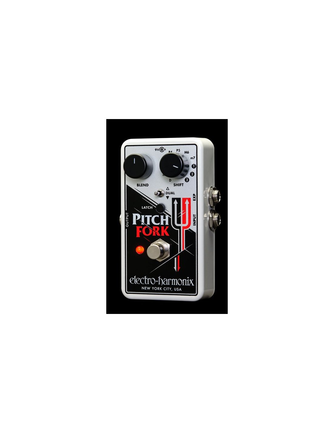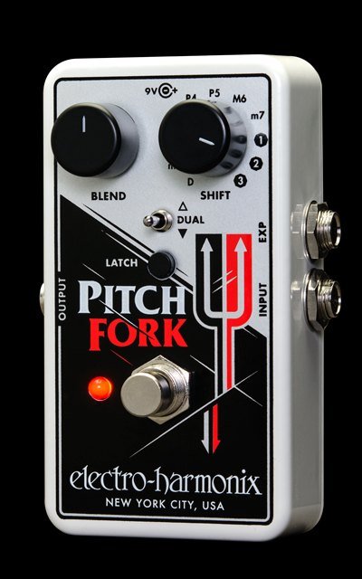 Electro Harmonix Pitch Fork Guitar Pedal. The Electro Harmonix Pitch Fork is a polyphonic pitch shifter with guitar pedal. It is equipped with the Blend control, the Shift rotary control to select 11 pitch shifter modes, the Dual switch, the Latch button and the input for the expression pedal