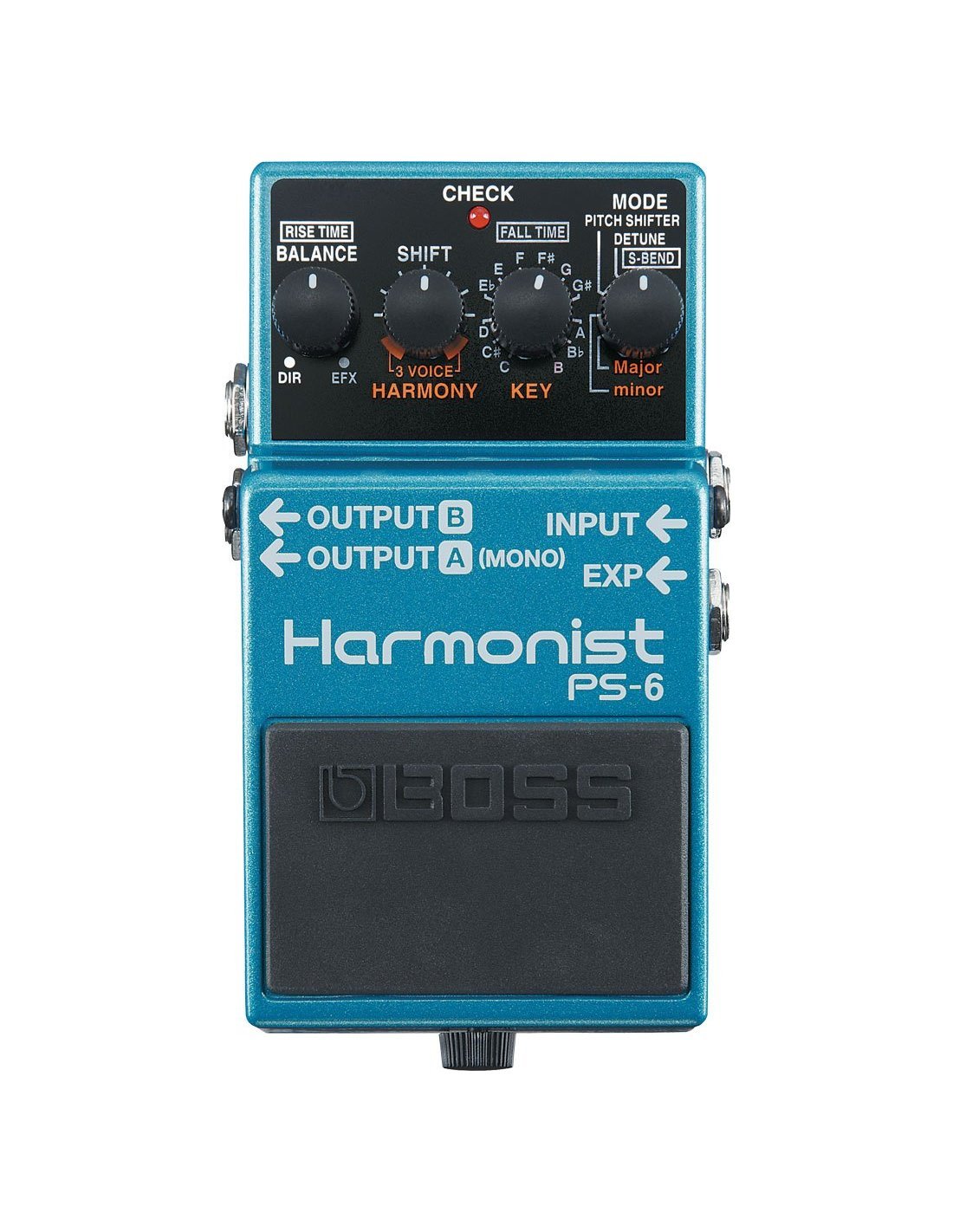 Boss PS6 Harmonist Guitar Pedal. The Boss PS6 Harmonist is a guitar pedal stereo pitch shifter with 4 intelligent pitch-shift effects (Harmony, Pitch Shifter, Detune, S-BEND) and 3 harmony voice. It is equipped with Balance, Shift, Fall Time, Mode controls and an expression pedal input (to control the pitch)
