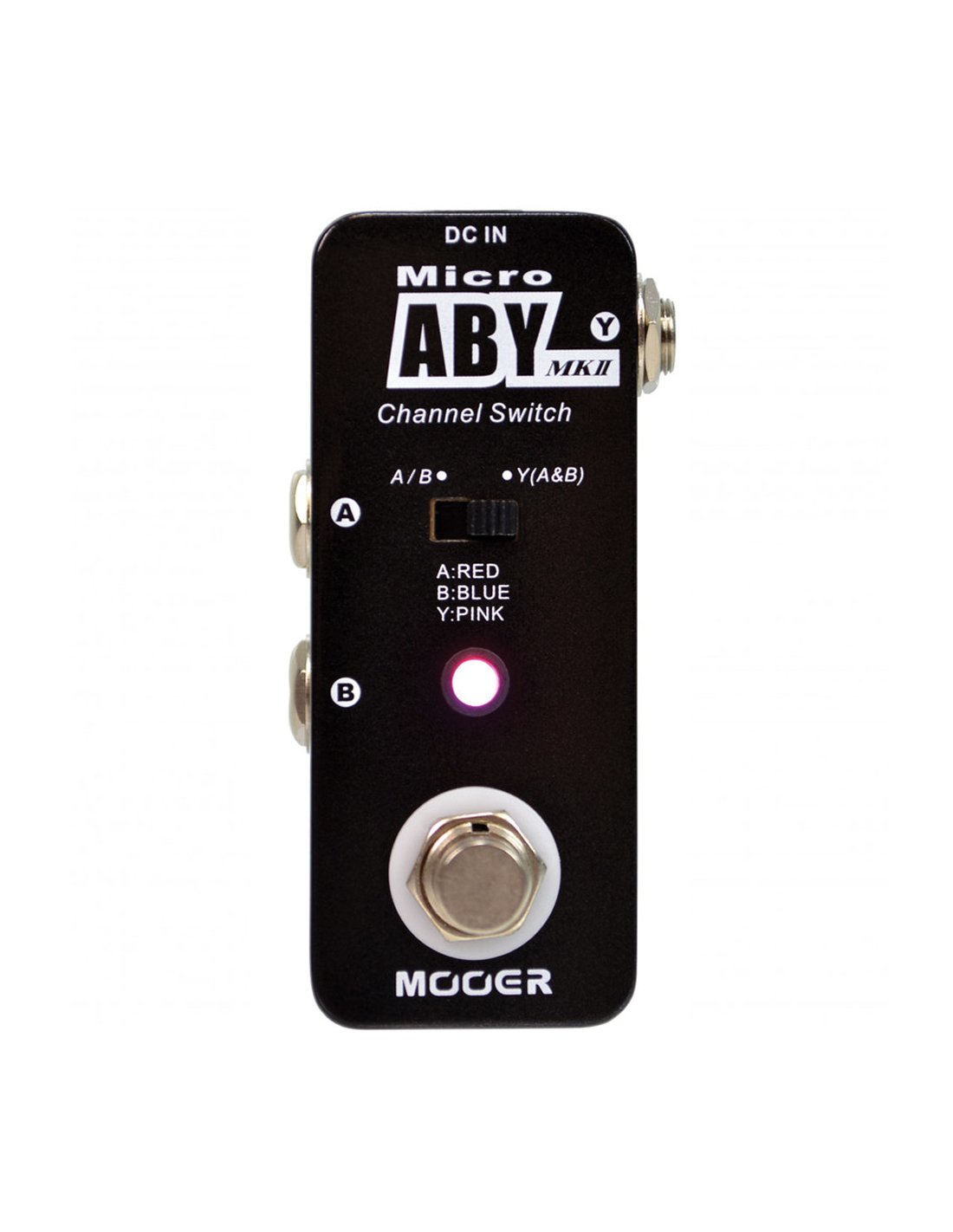 Switcher ABY<br /><br />• Micro ABY può essere utilizzato in entrambe le direzioni: il percorso del segnale può fluire da Y ad A o B, oppure da B o A ad Y<br />• Nella modalità A/B il segnale proveniente da Y può essere alternato all'uscita A o B (ad esempio una chitarra e due amplificatori). Oppure, in direzione opposta, i segnali provenienti da A o B vanno ad Y (ad esempio due strumenti nello stesso amplificatore)<br />• Nella Modalità Y(A&B) sono invece attivi contemporaneamente i tre ingressi/uscite in entrambe le direzioni, per una totale versatilità di utilizzo (in questa modalità il footswitch non è attivo)<br />• Micro ABY MKII può funzionare senza alimentazione (in questo caso il LED non sarà illuminato)<br />• Passivo (l'alimentazione serve esclusivamente per il led)<br />• Dimensioni Ultra-Compatte<br />• Chassis completamente in metallo <br />• Alimentazione: DC 9V (Alimentatore non incluso)