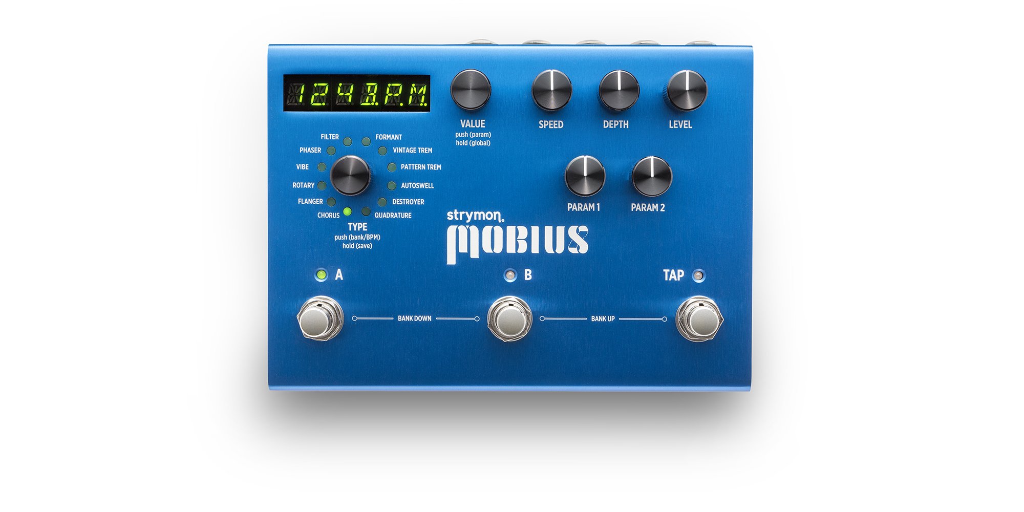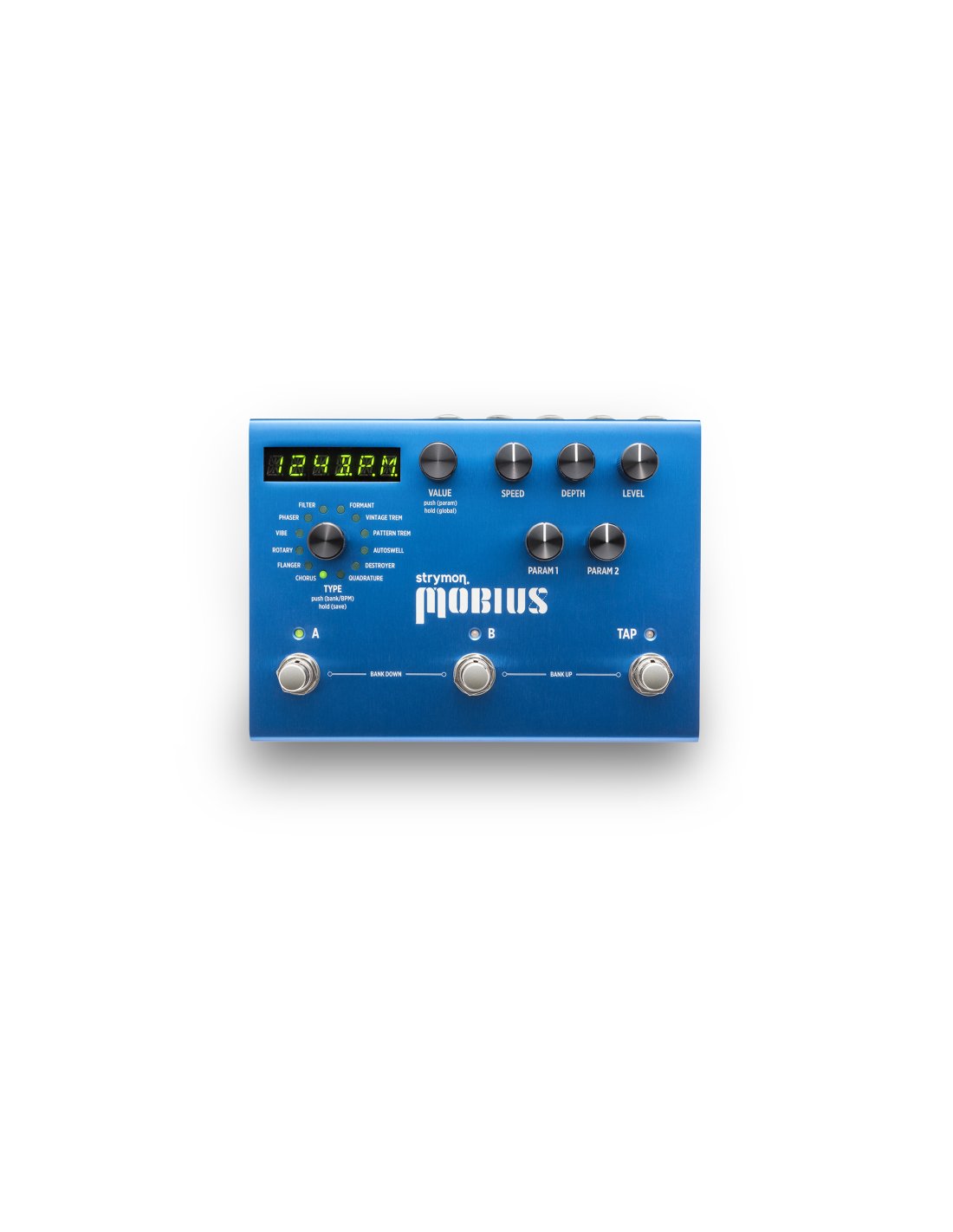 Strymon Mobius Guitar Pedal. The Strymon Mobius is a digital guitar pedal dedicated to modulations that has the SHARC DSP to reproduce 12 types of effects. It is equipped with the Type control to select the effects (Chorus, Flanger, Rotary, Vibe, Phaser, Filter, Formant, Vintage Trem, Pattern Trem, Autoswell, Destroyer, Quadrature) and the Value, Speed, Depth, Level, Param 1, Param 2 controls. On the front panel there is a large LED display that allows you to view and control the parameters of the 200 presets it has. Three foot switches allow the selection of presets, the bypass of the effects and the control of Tap Tempo. It is equipped with stereo inputs and outputs, expression pedal input and MIDI In/Out connections