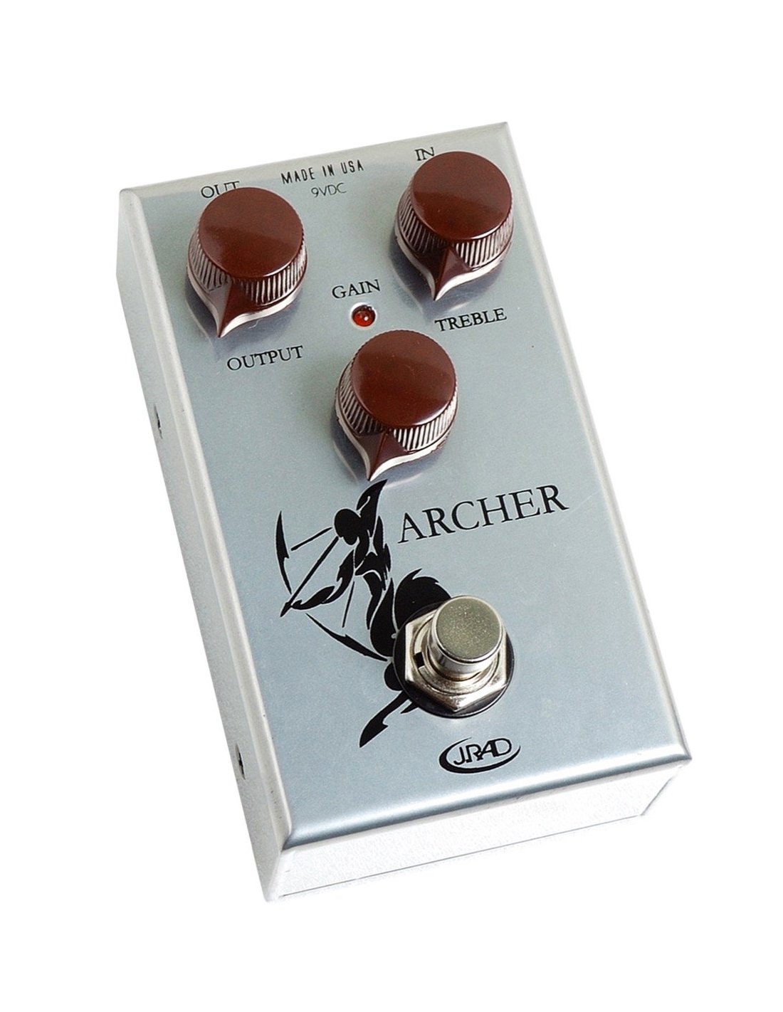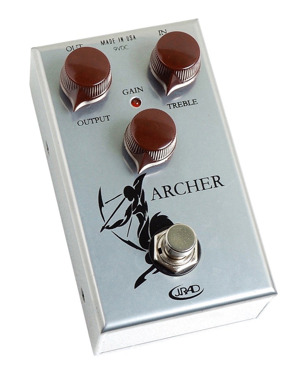 J. Rockett Archer Overdrive/Boost Guitar Pedal. The J. Rockett Archer Overdrive/Boost is an overdrive/boost guitar pedal with buffered switching. It is equipped with Output, Treble, Gain controls