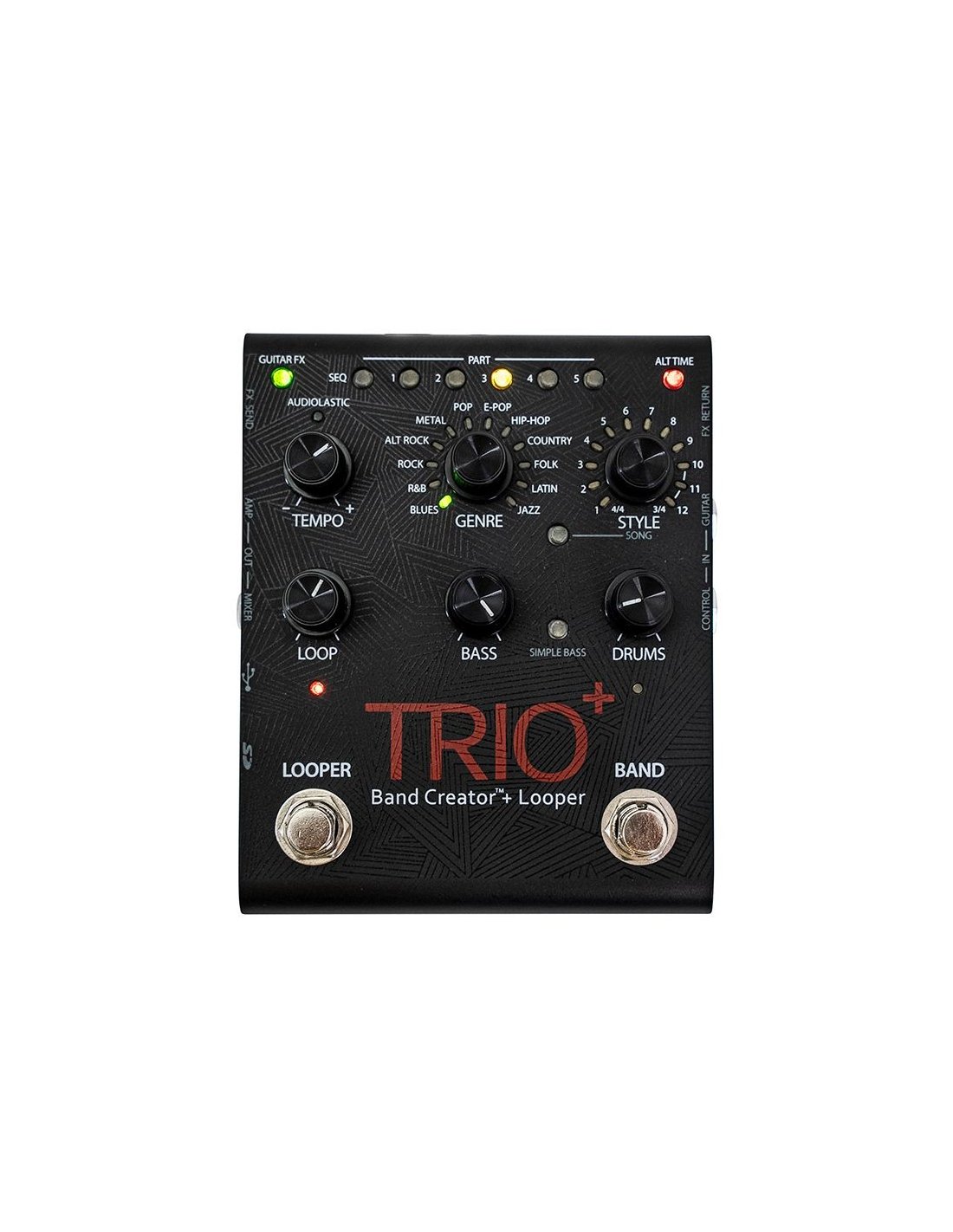 Digitech Trioplus Guitar Pedal. The Digitech Trioplus is a guitar pedal that can automatically generate bass and drum accompaniment simply by listening to what is played by the guitarist. It has 12 musical genres (Blues, R&B, Rock, Alt Rock, Metal, Pop, E-Pop, Hip-Hop, Country, Folk, Latin, Jazz), with 12 styles for each genre and with the possibility to choose between 3/4 and 4/4 times. It also includes a traditional looper that offers up to 230 seconds of recording per song part, unlimited overdubs, and the ability to create up to five programmable parts for each song. It has a microSD card (included)
