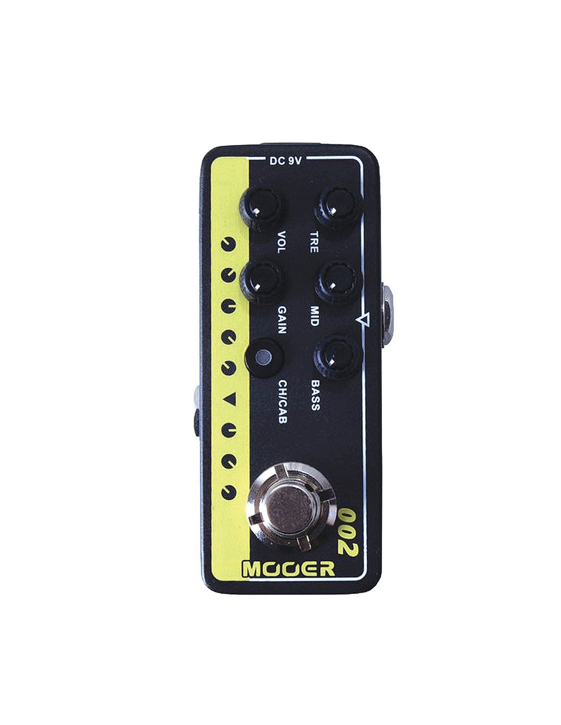Mooer 002 UK Gold 900 Guitar Pedal. The Mooer 002 UK Gold 900 is a guitar pedal preamp modeled on the Marshall JCM900, true bypass amplifier. It is equipped with two completely independent channels, integrated speaker simulation function that can be activated or deactivated, two modes of operation/channel selection, Volume, Gain, Treble, Middle, Bass controls