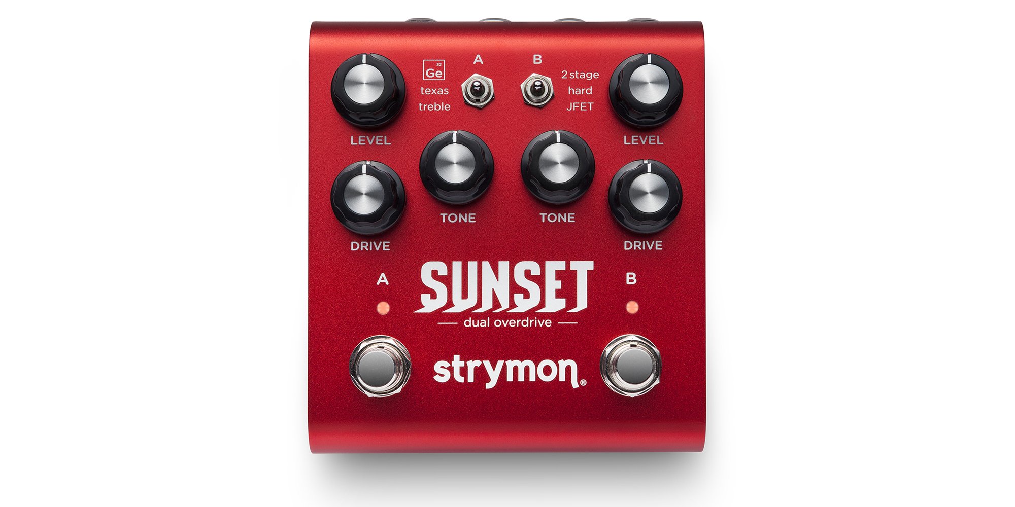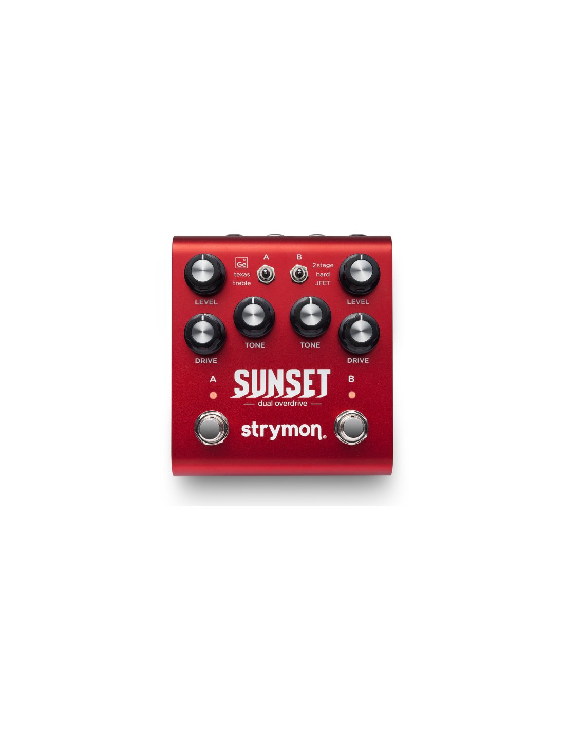 Strymon Sunset Guitar Pedal. The Strymon Sunset is a double overdrive guitar pedal featuring a very quiet class-A JFET circuit, providing up to 20dB of pure analog gain, combined with the powerful SHARC DSP. It is equipped with 2 channels (A, B) with independent Level, Drive, Tone controls, mini switches A, B to select Ge/Texas/Treble and 2 Stage/Hard/JFET modes, expression pedal input, input for Favorite switch. Two foot switches allow you to recall the two channels in series, in reverse series, or in