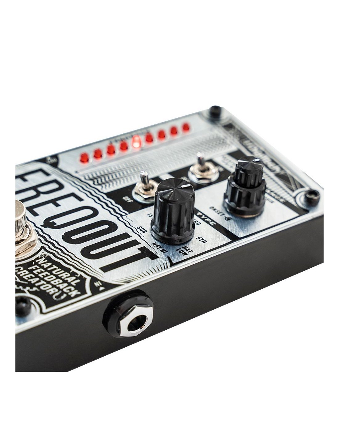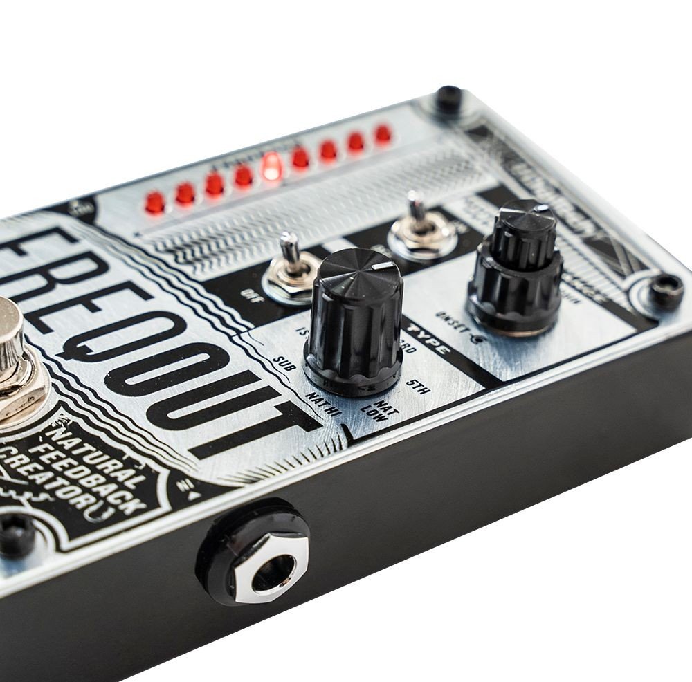 Digitech Freqout Feedback Guitar Pedal. The Digitech Freqout Feedback is a pedal that allows you to get feedback at any volume with or without distortion. It is equipped with the Type control to select the 7 feedback modes (1st, 2nd, 3rd, 5th, Nat Low, Nat Hi, Sub), the Range Gain/Onset control, the Momentary On/Off switch and the Dry On/Off