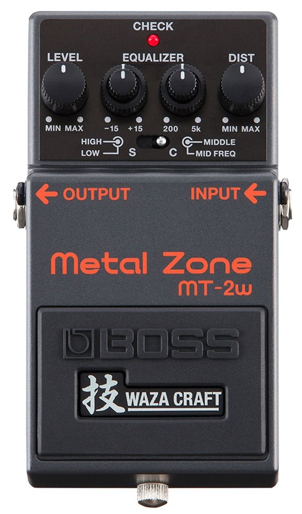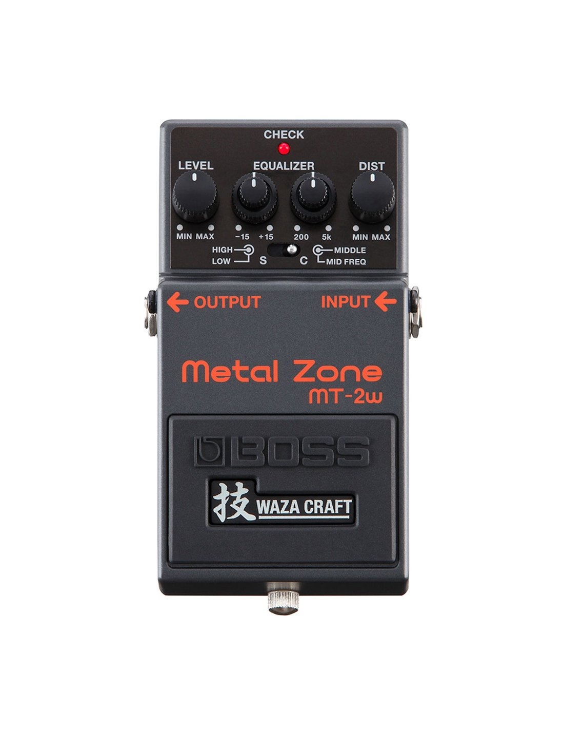 Boss MT-2W Metal Zone Waza Craft Guitar Pedal. The Boss MT-2W Metal Zone Waza Craft is a guitar pedal distortor made by Boss engineers in Japan with a fully analog circuit. It is equipped with Level, Equalizer High/Low and Middle/Mid Freq controls