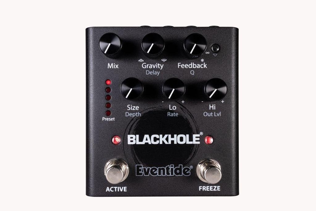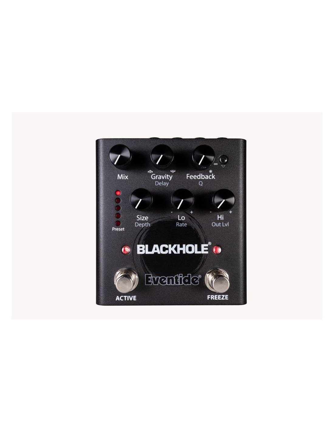 5 presets that can be recalled directly - 127 presets that can be recalled through Eventide Device Manager for PC or Mac - Mix, Gravity, Feedback, Size (Depth), Lo (Rate), Hi (Out Lvl) - Footswitch Active and Freeze - Selectable Mono/Stereo input - Stereo outputs - Line/Guitar level selector - Expression pedal socket - USB 2.0 connection (Type B) - Power adapter included
