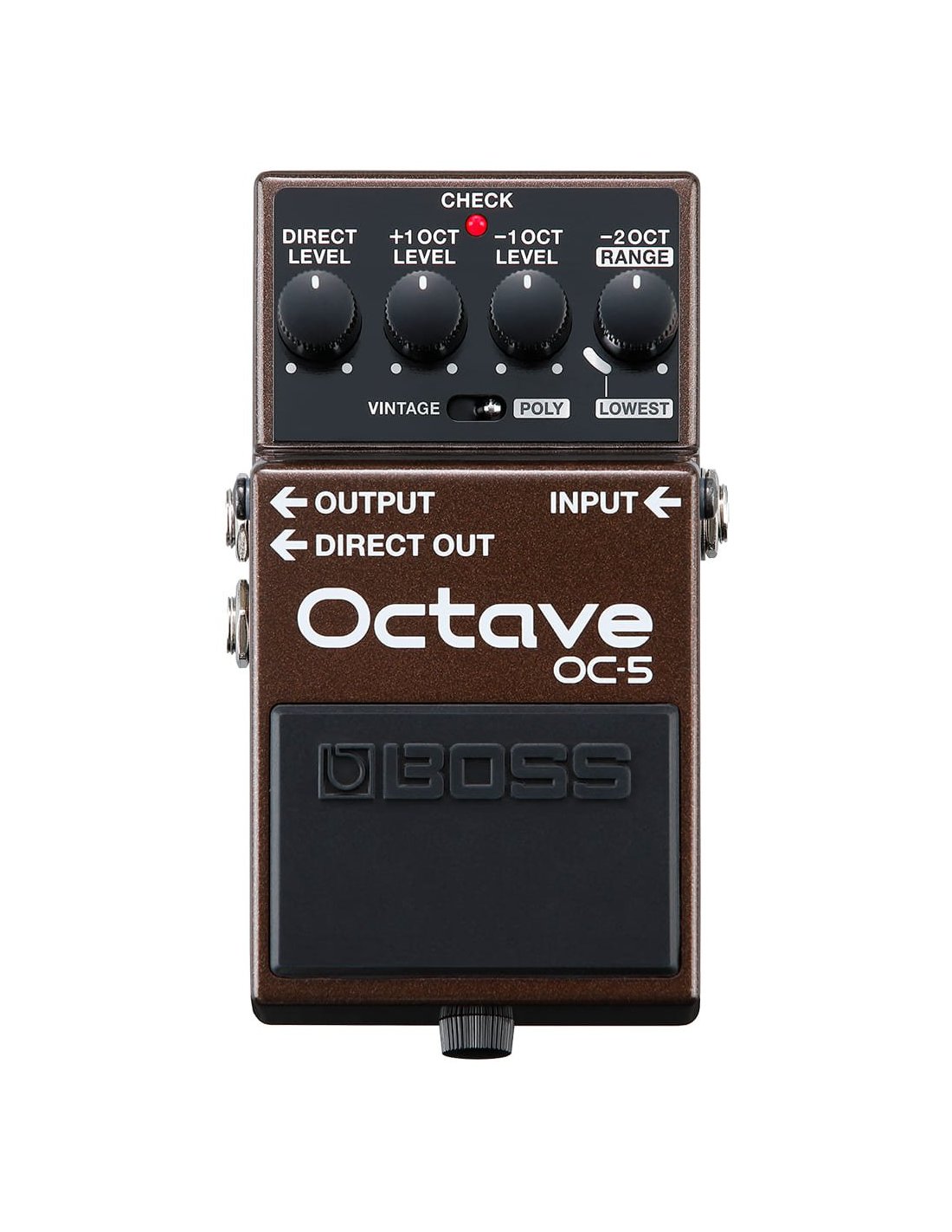 BOSS OC-5 Octaver guitar pedal. Technical features include Vintage mode to recreate the vintage sound of the OC-2 mono, Poly for tracking that can effect chords and multiple notes simultaneously, -1 OCT +1 OCT controls to adjust the Octaver level and Range command to set the extent of the effect. 9v battery