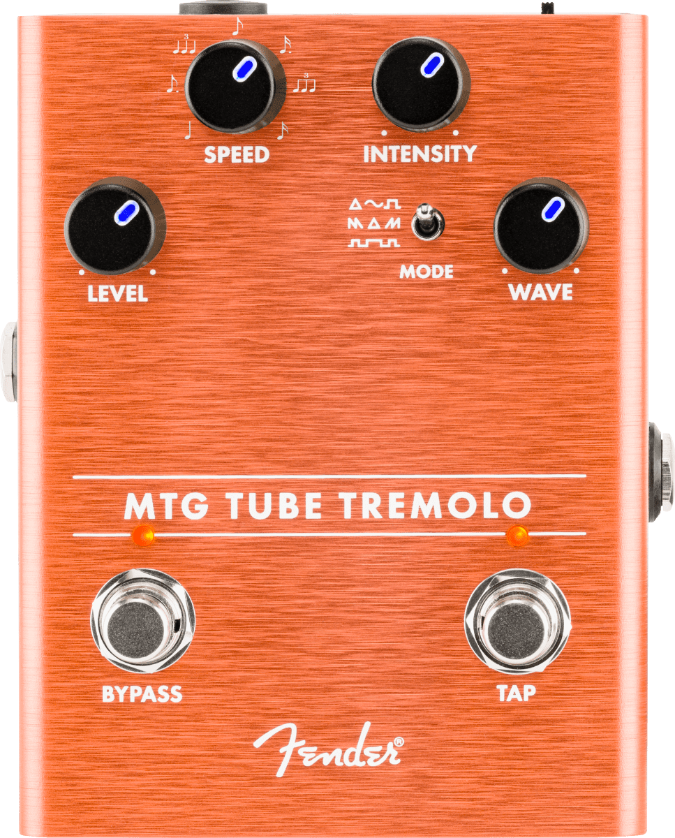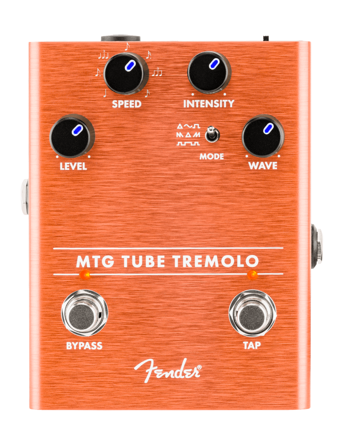 FENDER MTG TUBE TREMOLO is a pedal valve tremolo effect with 3 selectable oscillator types, footswitch for Tap Tempo, integrated NOS 6205 Preamp valve, Level, Speed, Intensity and Wave controls through LED backlit encoders, metal chassis. Works with 9v battery or power adapter (not included