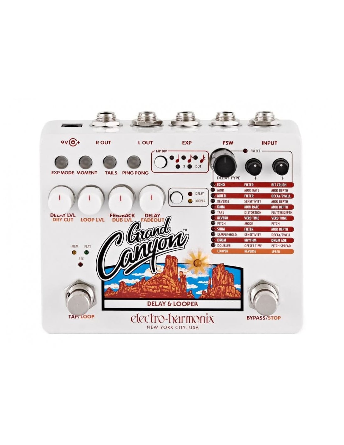 ELECTRO HARMONIX GRAND CANYON DELAY AND LOOPER is a Delay/Loop station guitar pedal. Technical features include multiple digital effects with a suite of 12 customizable Delay presets in 12 different modes (Echo, Mod, Multi, Reverse, Dmm, Tape, Reverb, Pitch, Shim, Sample/Hold, Drum, Doubler), Looper with up to 16 minutes of recording and unlimited overdubs. Equipped with 9.6V-200mA EHX power supply