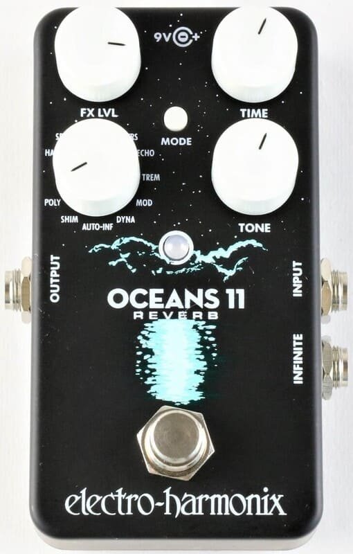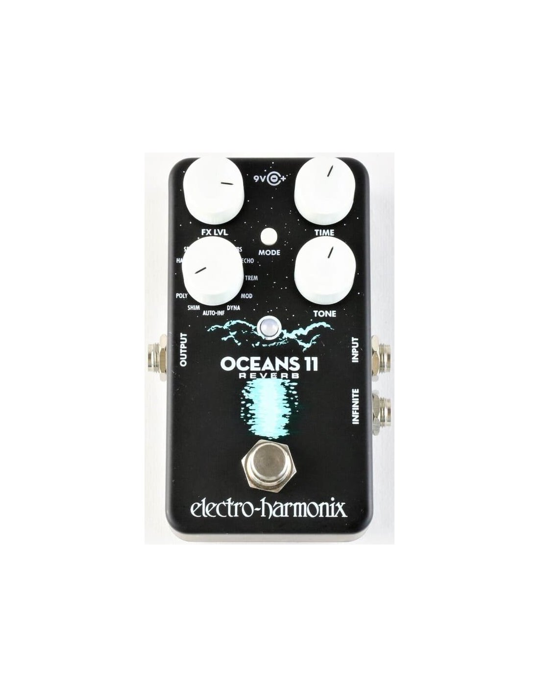 ELECTRO HARMONIX OCEANS11 is an 11-mode guitar reverb pedal. Technical features include 11 reverb modes (Hall, Spring, Plate, Reverse, Echo, Trem, Mod, Dyna, Auto-Inf, Shim, Poly), Fx level, Time, Tone controls. 9v power supply included