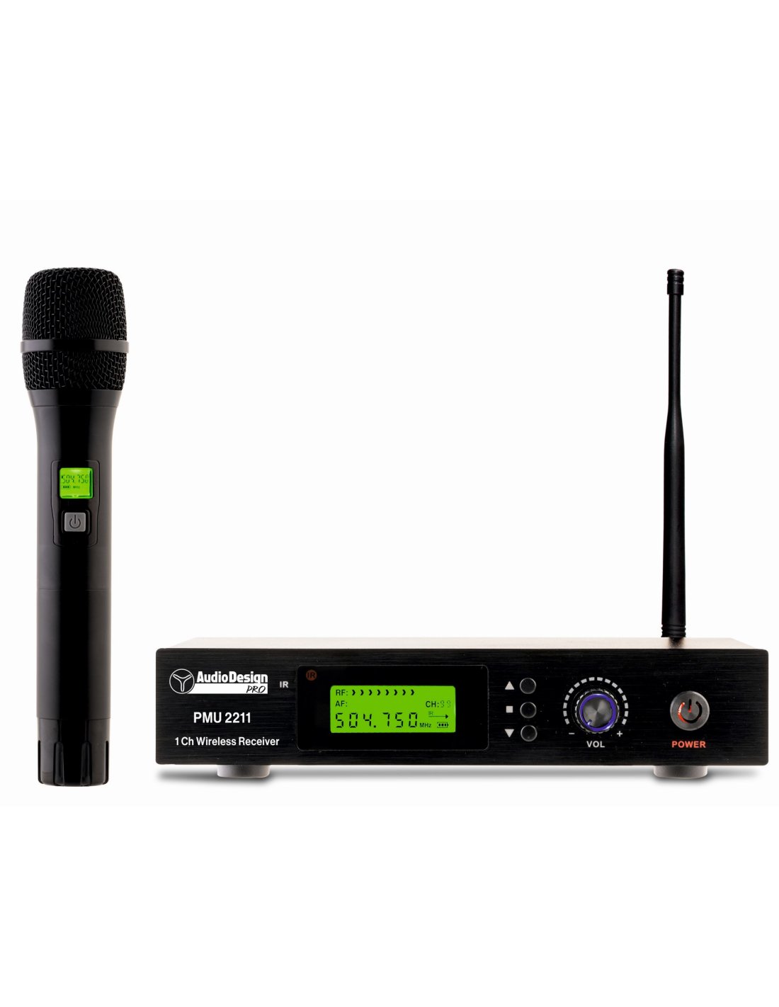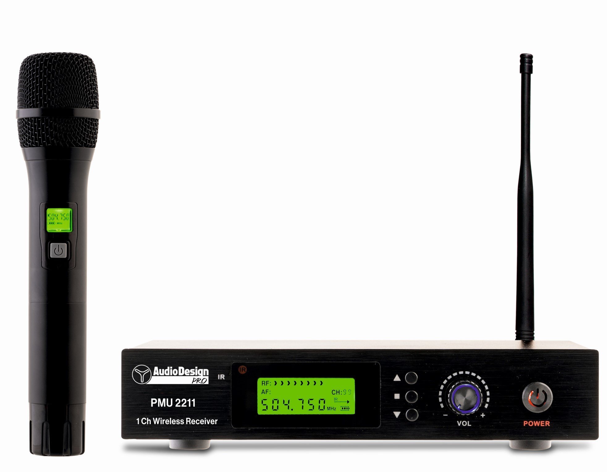 AUDIODESIGN PMU 2211 HANDHELD RADIO. 1-channel UHF wireless system consisting of receiver and handheld transmitter. Technical features include 100 selectable frequencies from 480,000 to 504,750 MHz, synchronous receiver/microphone via IR, Auto Scan function. Handheld radio microphone with cardioid polar pattern with display and battery status indicator, powered by 2 AA batteries, adjustable output volume, XLR