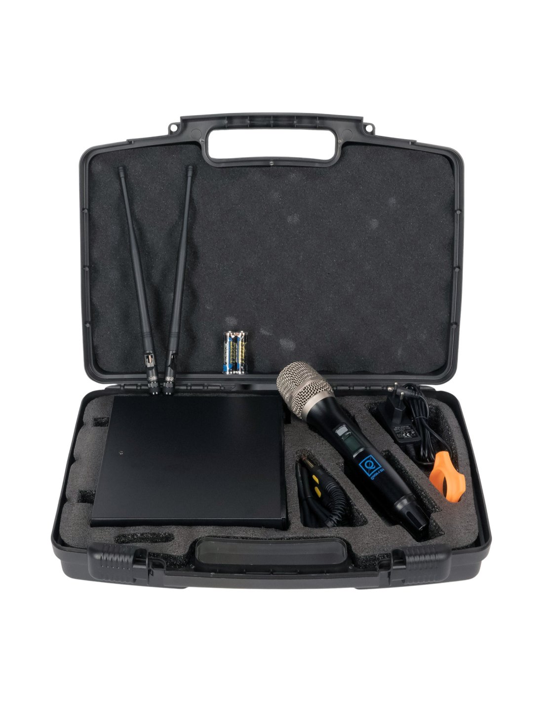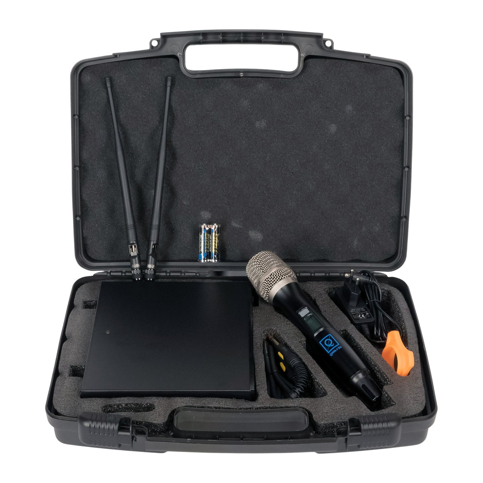 Professional UHF wireless microphone system with handheld transmitter. True diversity. A channel with selectable frequency. Integrated IC Frequency Control technology. IR sync. Smart mute mode. 50Hz-18Khz receiver frequency response. 105dB dynamic response. Range of action 100m. The transmitter uses 2 x 1.5v AA batteries.