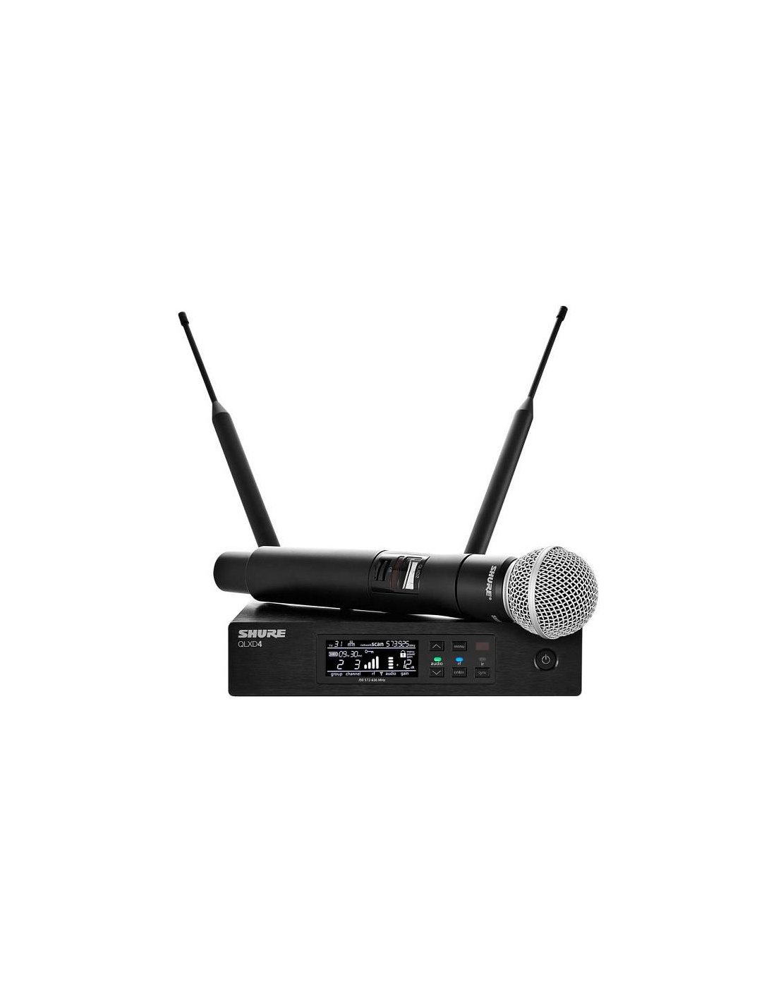 SHURE QLXD24E SM58 G51. Digital wireless system that includes Shure QLXD4 digital wireless receiver and QLXD2/SM58 voice microphone. Technical features include QLXD2/SM58 wireless handheld microphone with 24-bit digital audio quality, Shure SM58 microphone capsule, IR synchronization, AES 256-bit encryption for secure transmission, dynamic range of more than 120db, external charging contacts for charging on the dock, backlit LCD. The receiver has 64 MHz of bandwidth, more than 60 preset channels per band, G51 frequency range: 470 - 534MHz, up to 17 compatible systems per 6 MHz channel, 22 systems per 8 MHz channel, predictive diversity digital switching for a stable RF connection, 256-bit AES encryption, up to 60dB of adjustable gain, high-contrast LCD menu and controls with lock function, Audio and RF LED meter with peak indicator. It includes accessories for rack installation, screw and washer kit, 2 antennas, 2 BNC panel connectors, 2 55 cm antenna connection cables, 1 230VAC power adapter mod.PS23 with 1.5 m cable, 2 AA batteries,