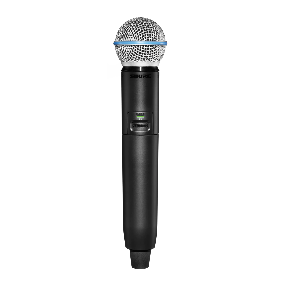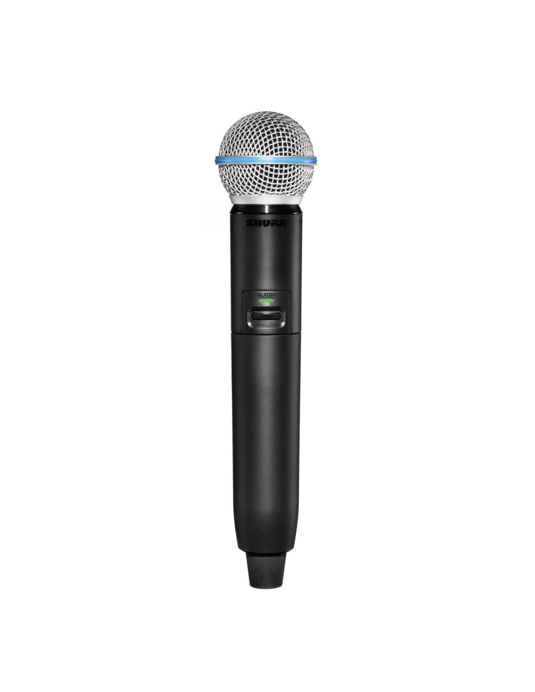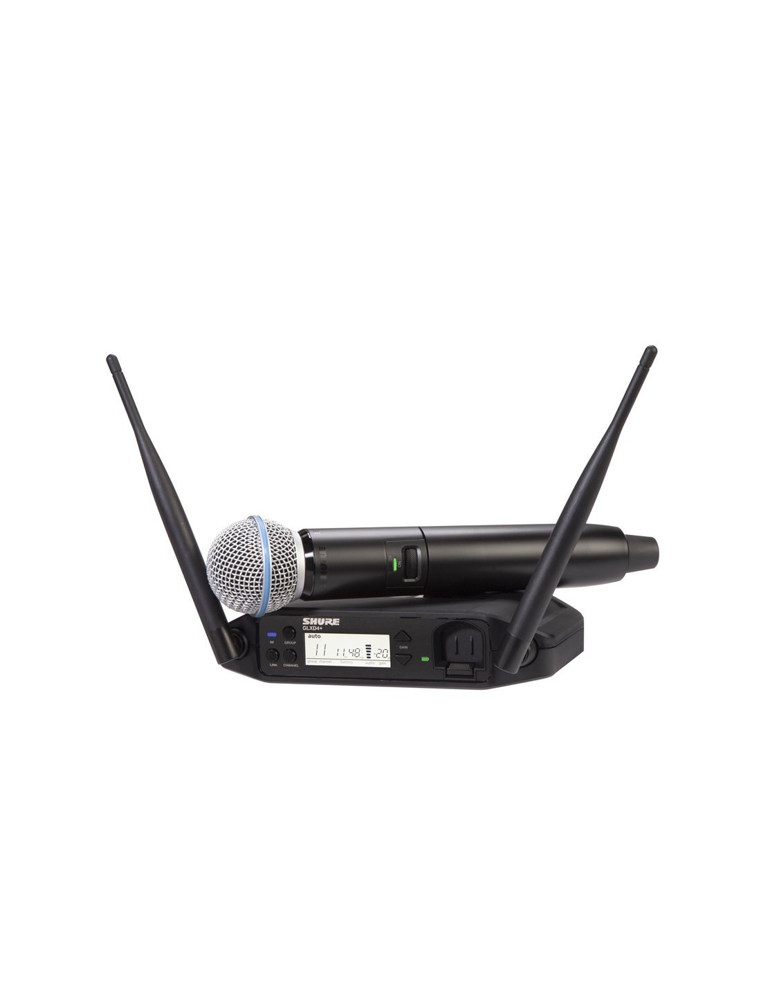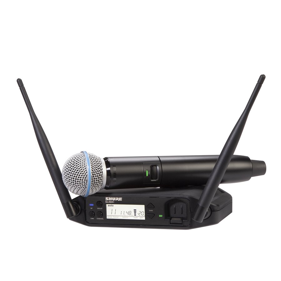 SHURE GLXD24+ BETA58. Digital wireless system that includes Shure GLXD24+ receiver and Beta58A voice microphone (GLXD2+ handheld transmitter). Technical features include automatic frequency management with dual-band technology (2.4GHz and 5.8GHz) and up to 8 simultaneously selectable systems with Frequency Manager 16, high-resolution LCD display on the receiver with battery charge indicator in hours and minutes, integrated battery charging slot, Beta58A dynamic microphone capsule with a frequency range of 50 - 16,000 Hz and supercardioid polar pattern, signal range up to 60m. Includes Shure Li-ion battery, charger and EVA case