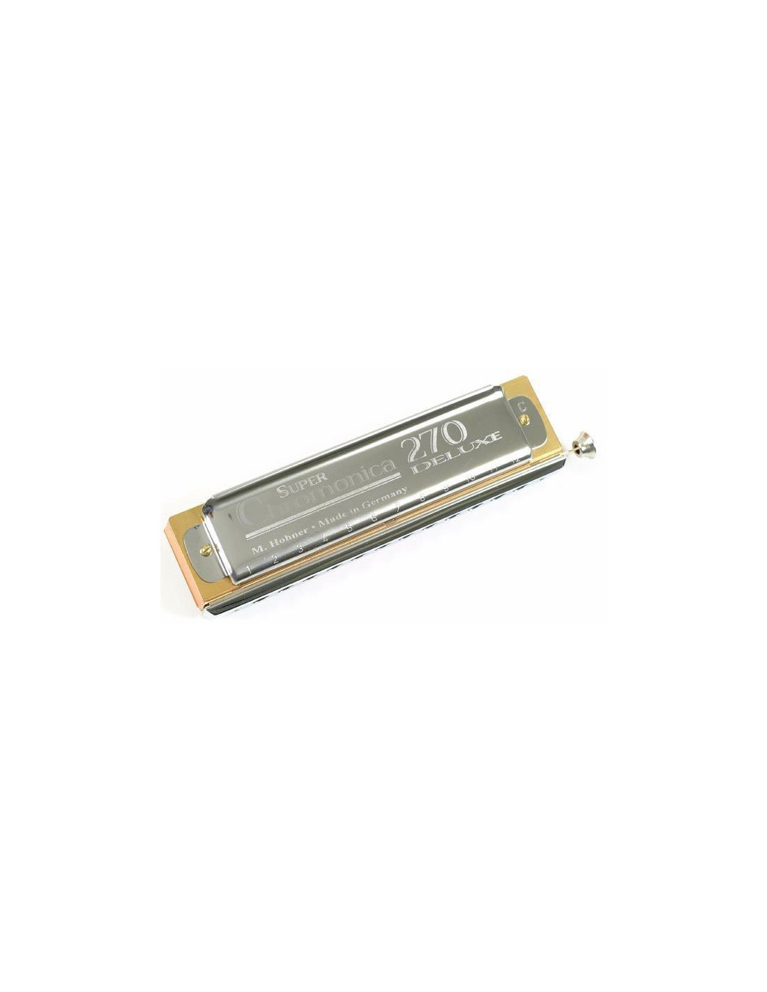 The Hohner Super Chromonica Deluxe 270/48 is a chromatic harmonica in C; technical features include 12 holes, 48 brass reeds, modulator button and stainless steel cover.