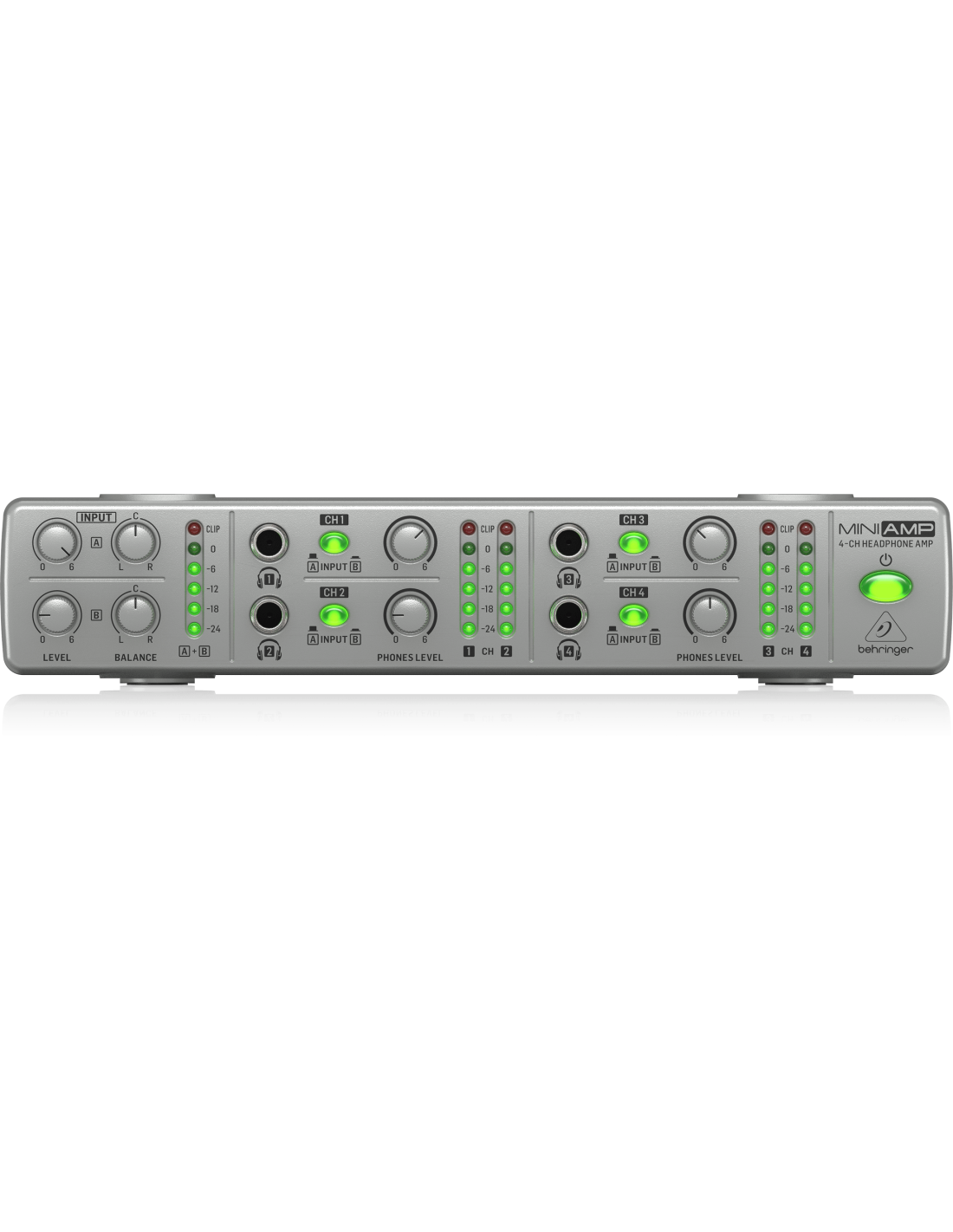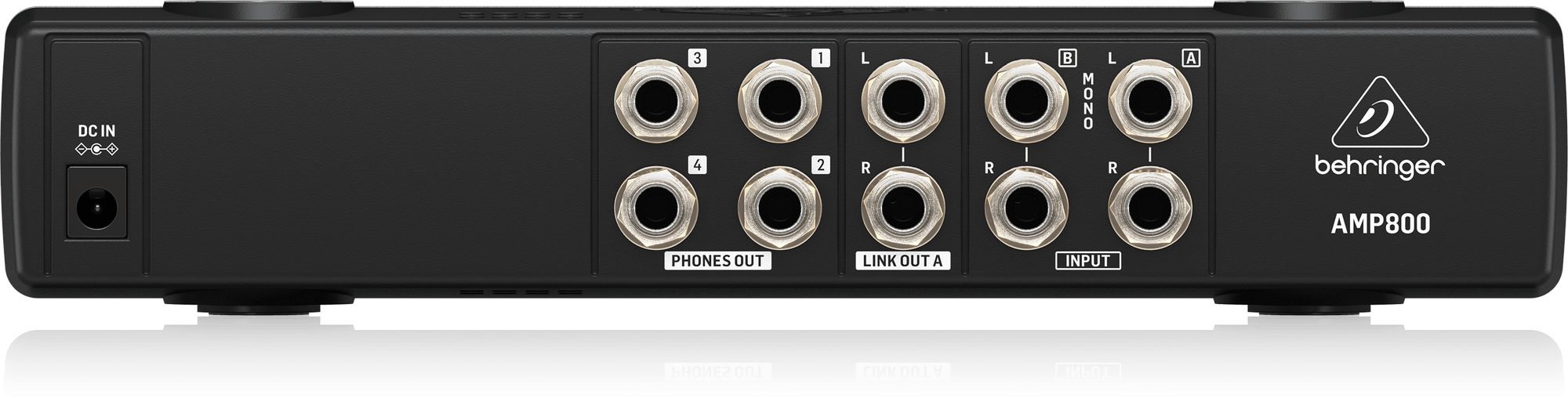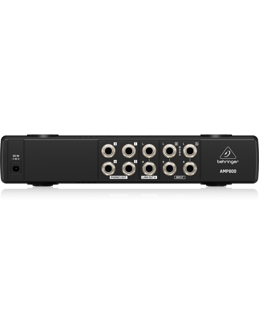 BEHRINGER AMP800 V2 is a 4-channel stereo headphone amplifier. Technical features include 4 high-power stereo amplifier sections each with double output, volume control knob and 6-segment LED meter on each channel, 2 headphone outputs per channel (front and rear panel), to connect a total of 8 headphones at the same time, Link A output to connect other amplifiers in cascade,