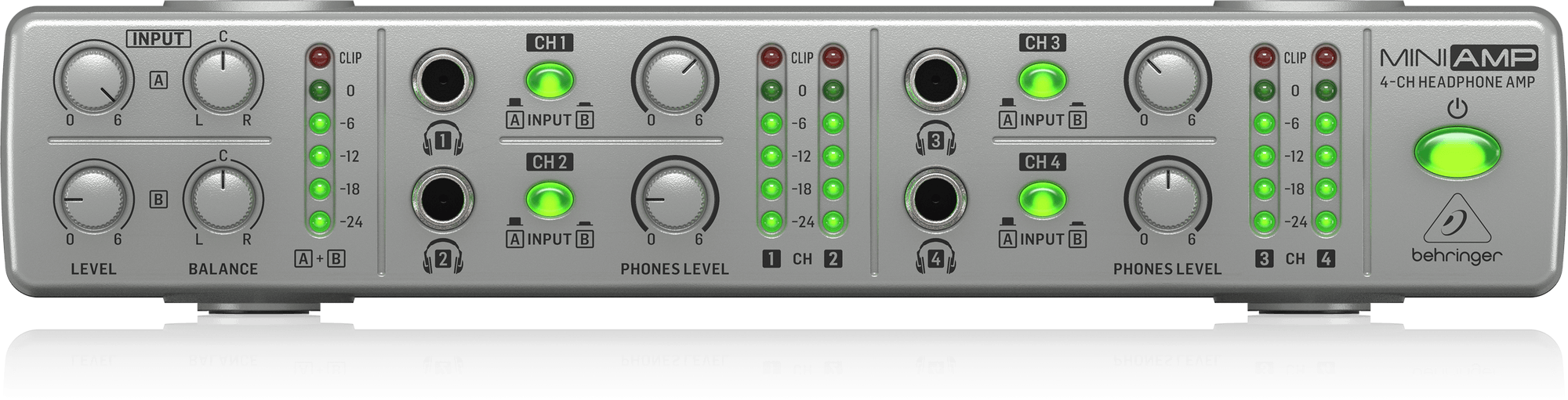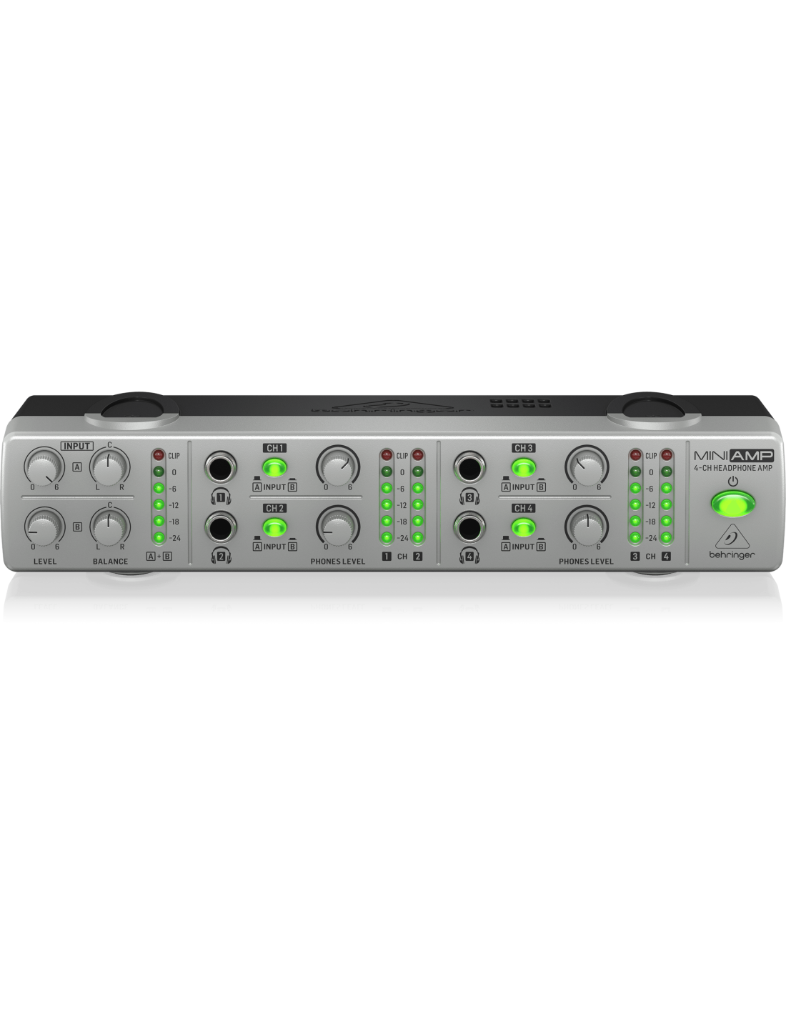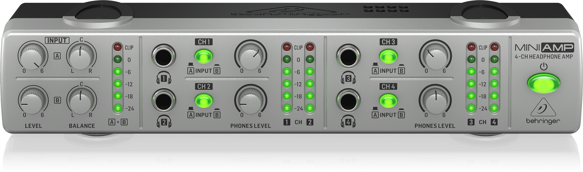 BEHRINGER AMP800 V2 is a 4-channel stereo headphone amplifier. Technical features include 4 high-power stereo amplifier sections each with double output, volume control knob and 6-segment LED meter on each channel, 2 headphone outputs per channel (front and rear panel), to connect a total of 8 headphones at the same time, Link A output to connect other amplifiers in cascade,