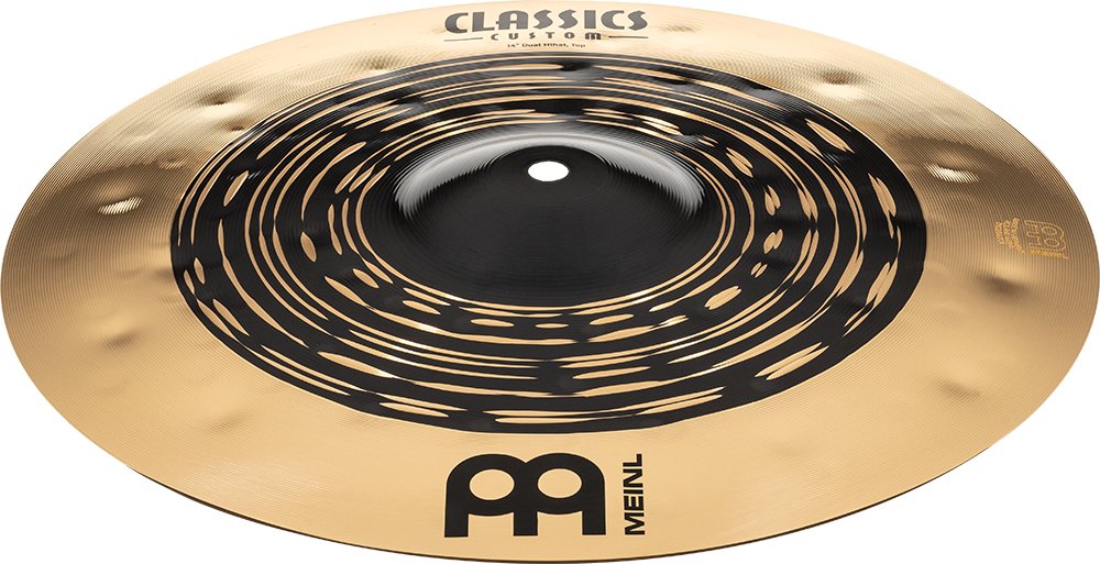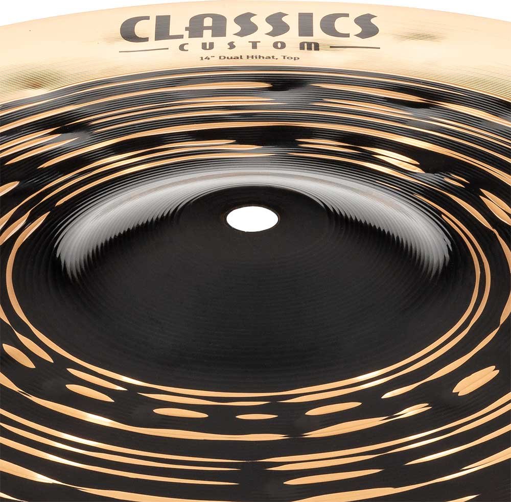 'Classics Custom Dual 14" Hihat. The new Classics Custom Dual have spectacular aesthetics, but their sound characteristics are even more so. The dark base sound, the turning and the shiny outer part, give great versatility and excellent response to the rod. The dark central part gives the plate an explosive and powerful character. The plates are made in Germany, with B12 Bronze alloy. We also consider it important to emphasize that they are made from 100% renewable energy that we produce in our plant.