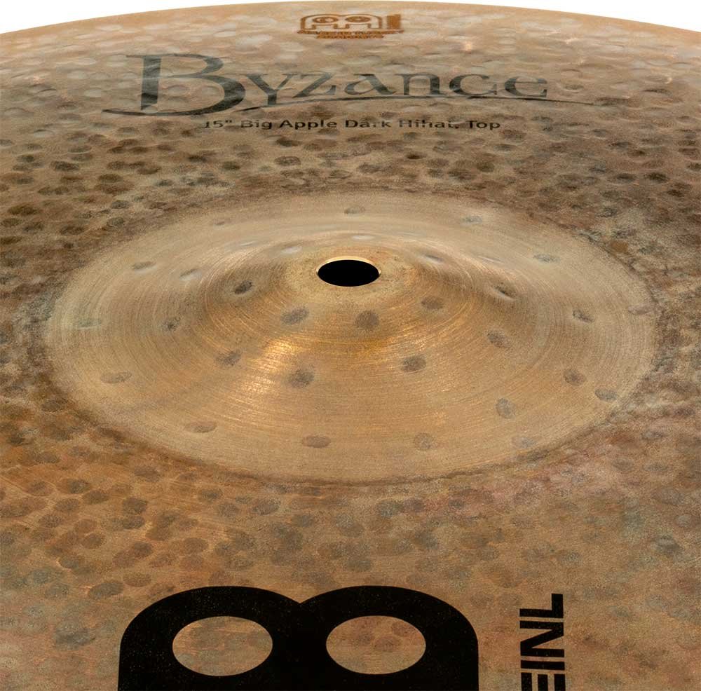 'Big Apple Dark Hi-hat 15"”, Byzance Dark Series. The Byzance Dark series plates are handcrafted in our factory in Turkey by specialists and respecting tradition throughout the process. All plates are made of B20 bronze alloy discs. Various techniques are involved in the process, both beating and turning. The Dark Unturned finish gives each cymbal a defined sound with little sustain. Really nice in the mix.