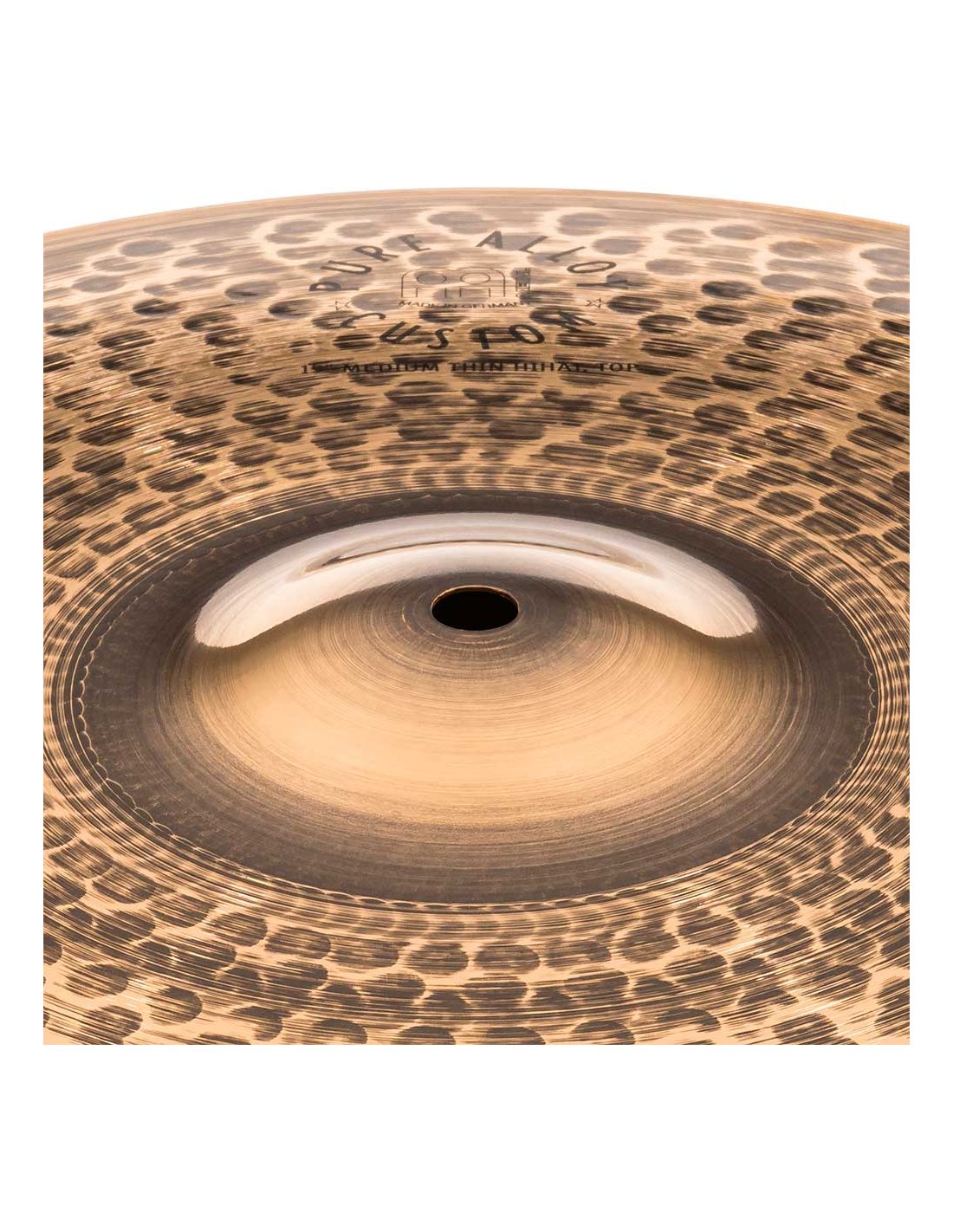 'Hi-hat 15" Medium Thin, Pure Alloy Custom Series. The Meinl Pure Alloy Custom series cymbals combine the characteristics of classic European cymbals with the articulation of a modern cymbal. With a pronounced hammered upper part and a completely turned and polished lower part, they are expressive and very articulated. These characteristics make them perfect for many musical styles such as pop, rock, fusion, ethnic music, and everything in between.