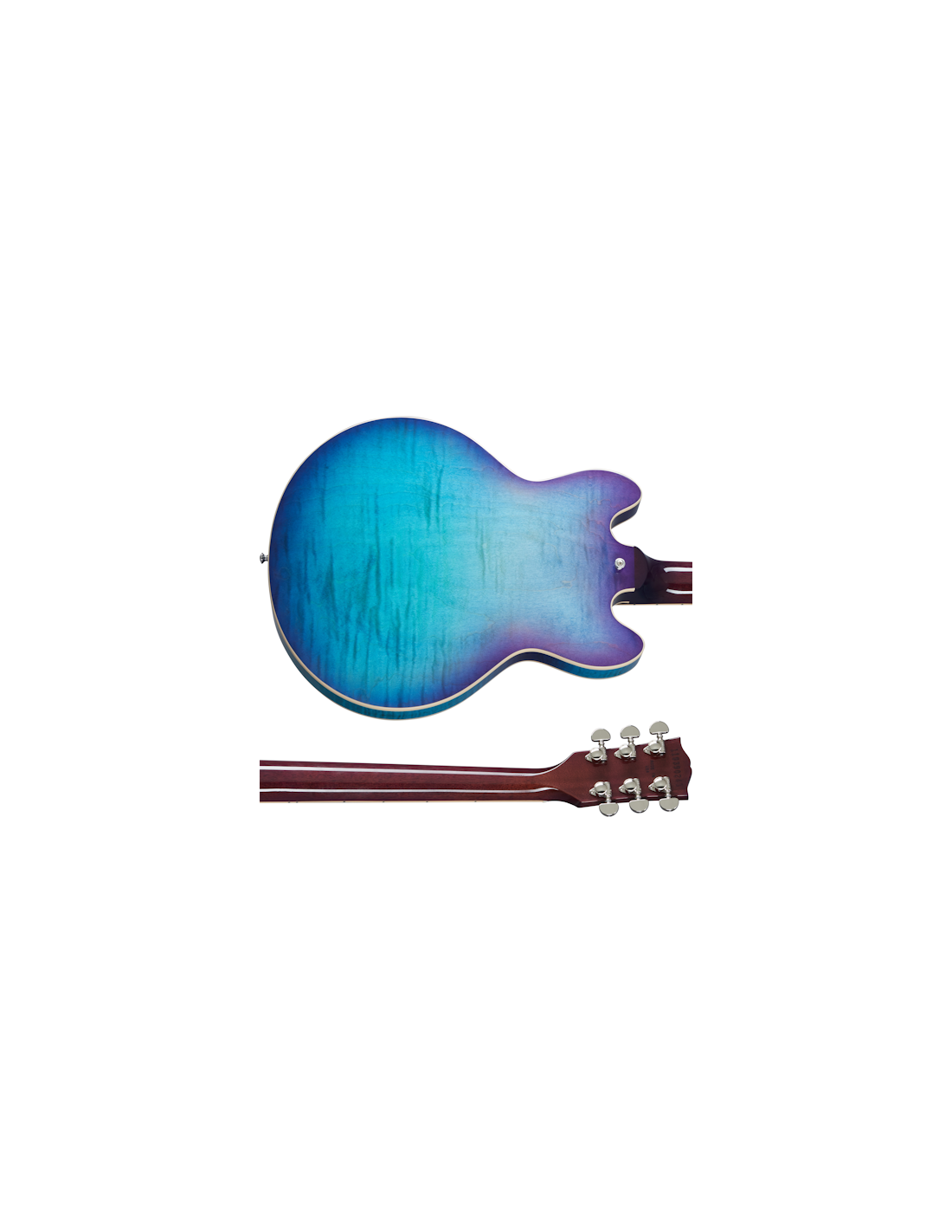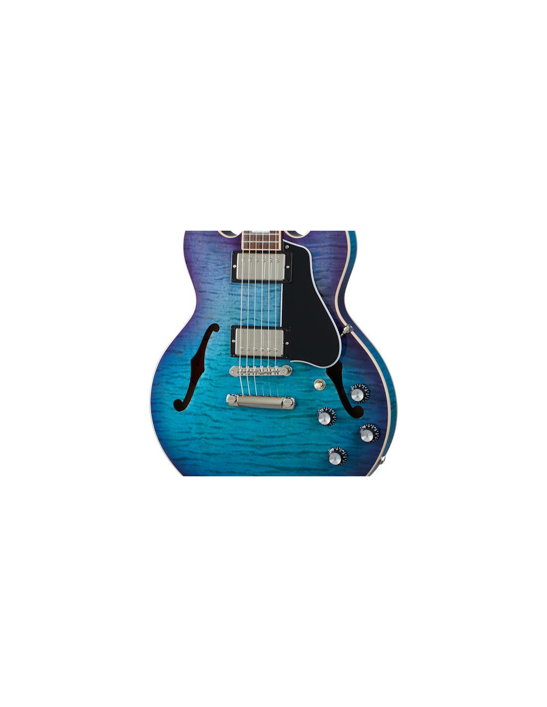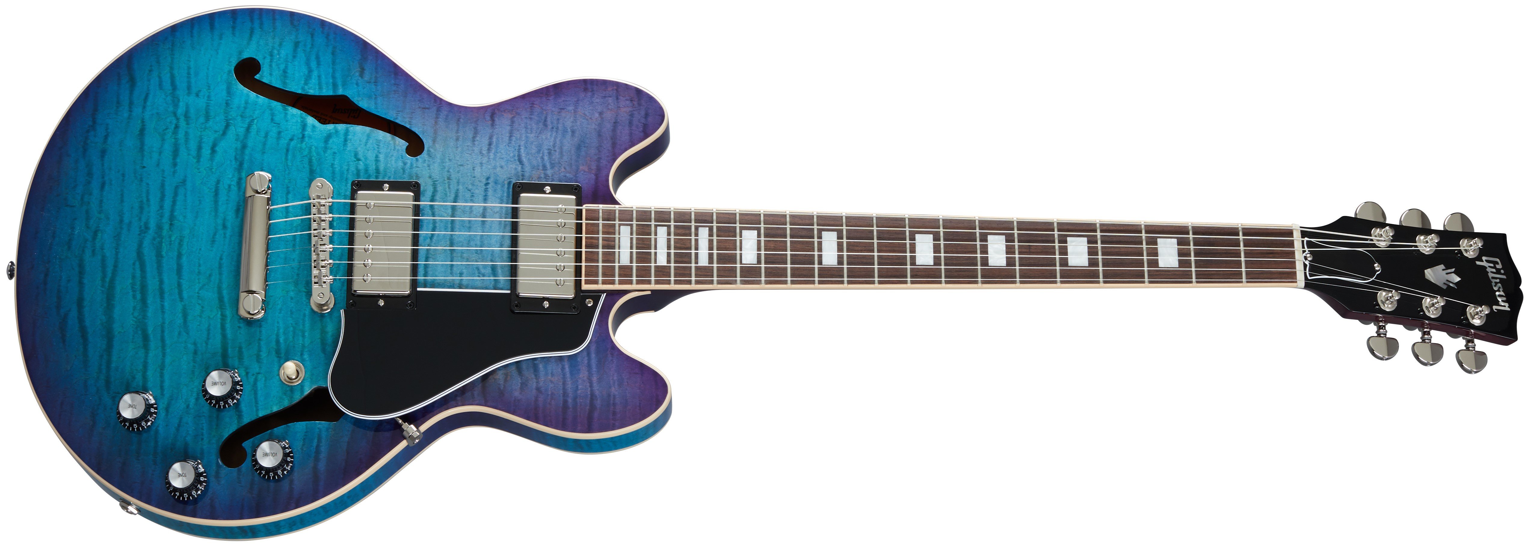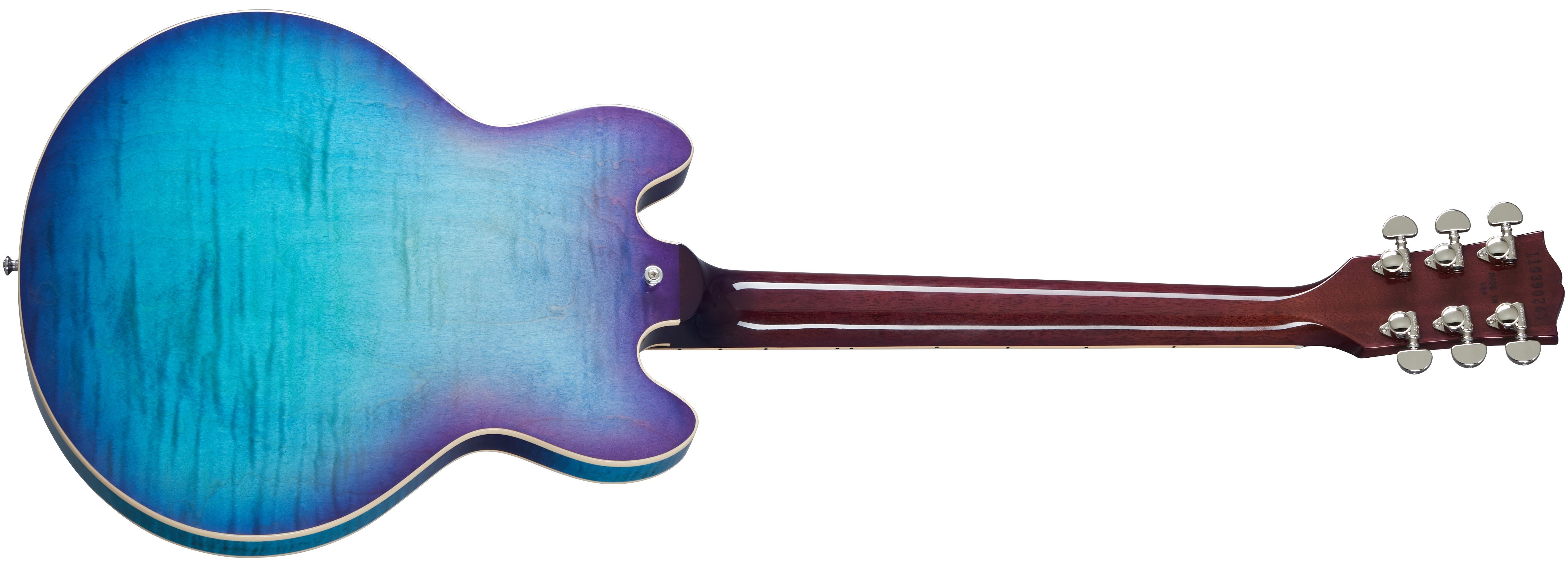 GIBSON ES-339 FIGURED BLUEBERRY BURST. Gibson ES-339 Figured Blueberry Burst Hollow-Body Electric Guitar with lacquer finish. Technical features include 3-layer maple/alder/maple laminated maple body, solid mahogany neck with rounded C profile, 12" radius Indian rosewood fingerboard and 22 Medium Jumbo frets, mother-of-pearl dot inlays. The electronics are equipped with 2 Humbucker 57/57 Classic+ pickups with separate volume and tone controls for bridge and neck pickups, hand-wired toggle selector, and 500k potentiometers. It also features nickel-plated hardware, ABR-1 Tune-O-Matic bridge, Grover Rotomatics mechanics with Kidney knobs, Switchcraft 3-way pickup selector. Gibson hard case included.