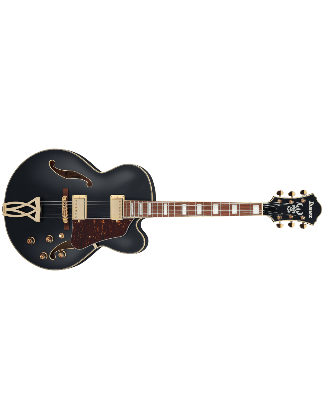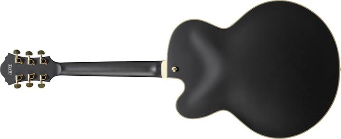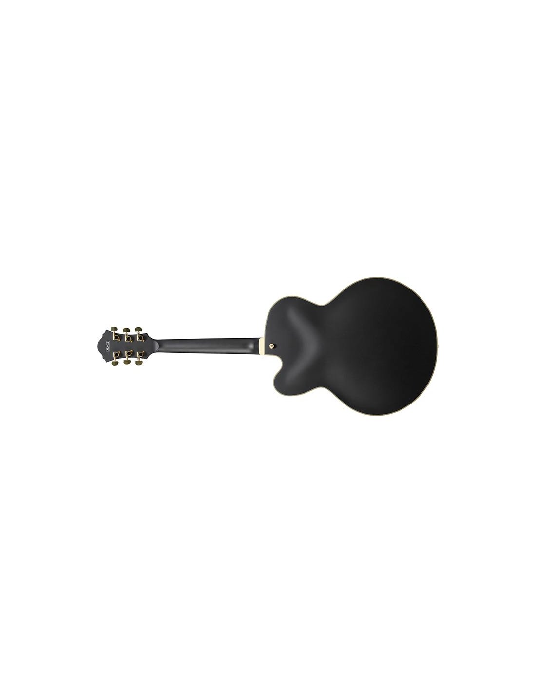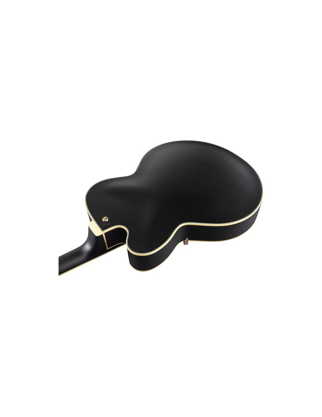 IBANEZ AF75G BKF is an Ibanez Artcore series hollow-body semiacoustic guitar with Linden lime top, back and sides, Nyatoh AF Artcore neck, Walnut fingerboard with 22 medium frets, rectangular white inlays and Black Flat finish. The electronics are equipped with 2 Classic Elite Humbucker pickups on the neck and bridge with 2 volume controls, 2 Tone controls and 3-Way pickup selector. It also features a Gibraltar Performer bridge with VT60 tailpiece and gold hardware