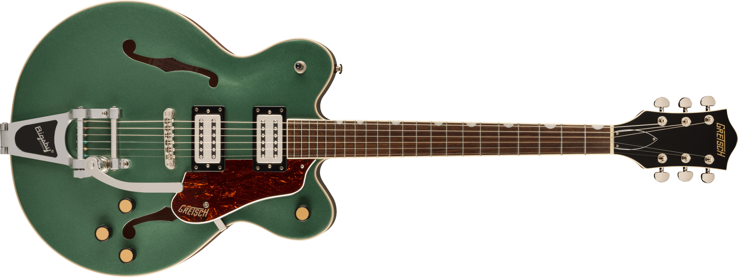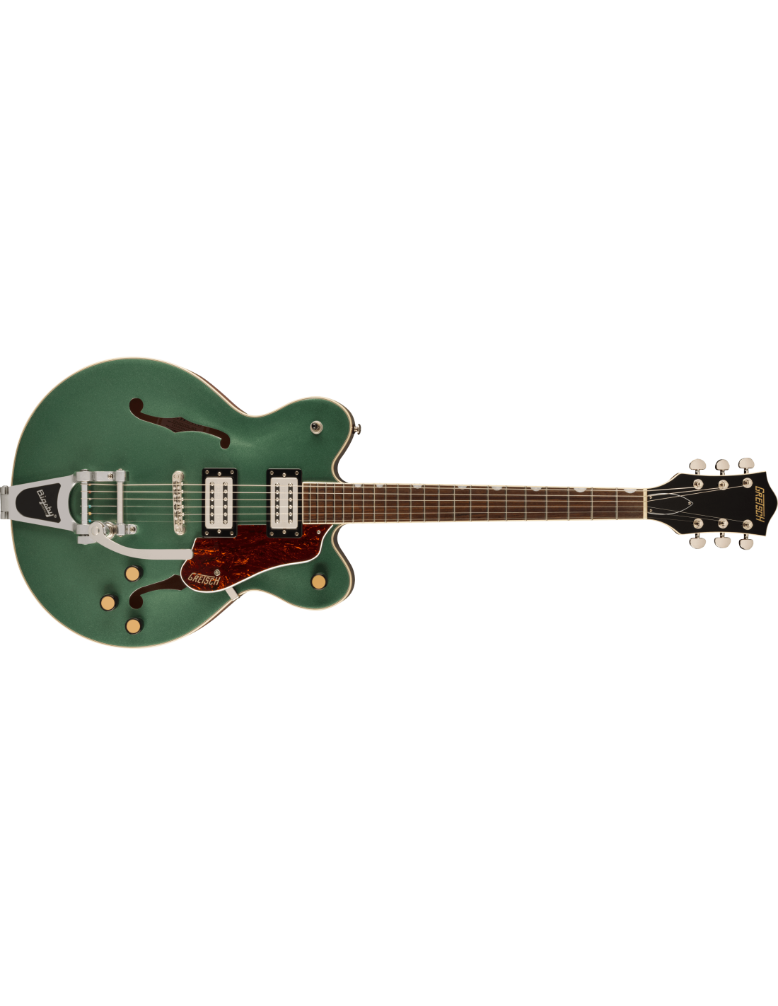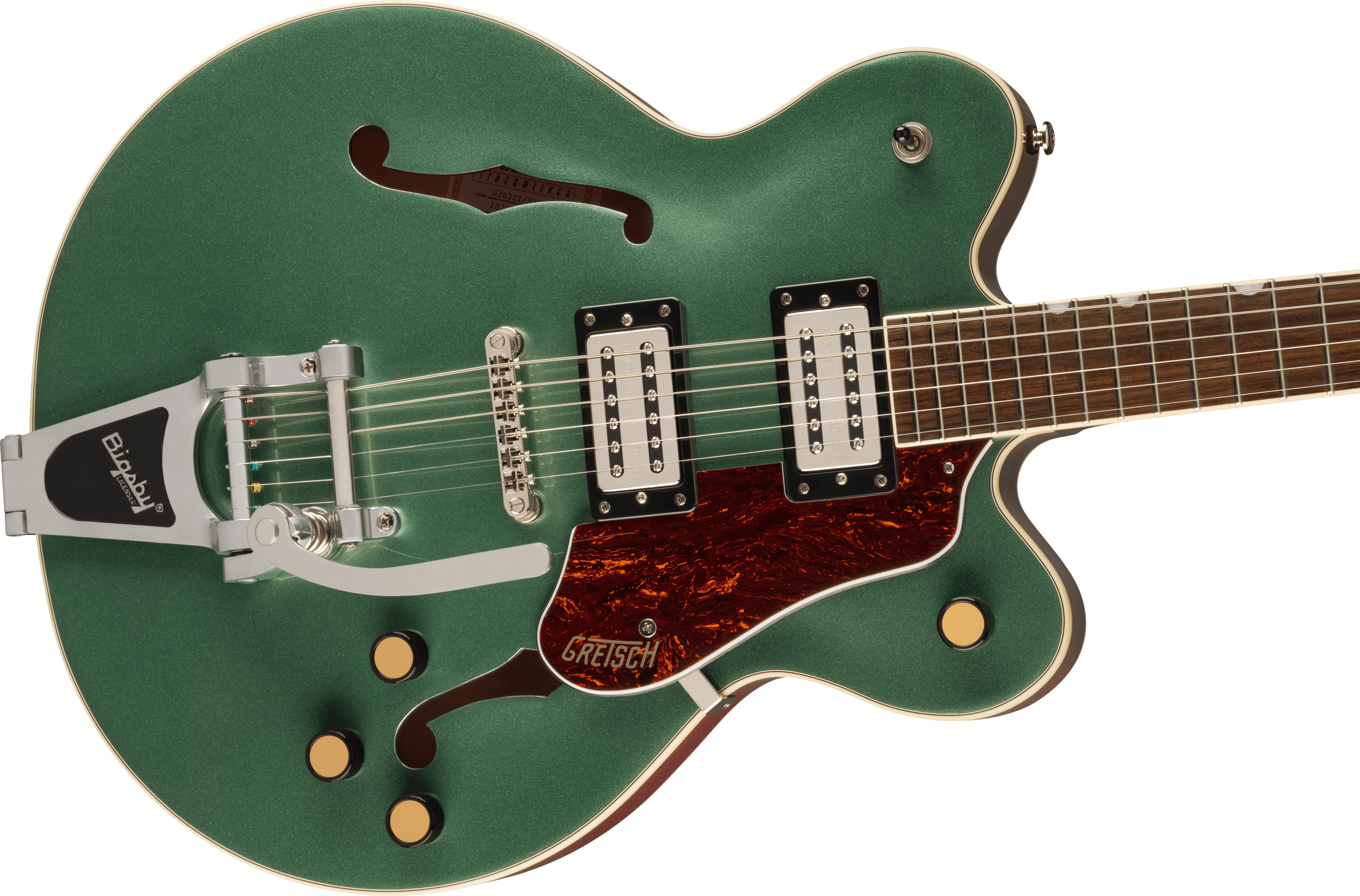 Gretsch G2622T Streamliner CB DC Semiacoustic Guitar color STEEL OLIVE. The Gretsch G2622T Streamliner Center Block Jr. Double-Cut is a 6-string semiacoustic guitar. Technical features include laminated maple body, arched top and bottom, enlarged F-holes, nato neck with a Soft C profile, laurel fingerboard with 22 medium jumbo frets, two Gretsch Broad'Tron BT-2S humbuckers, Adjusto-Matic bridge with bay base, Bigsby