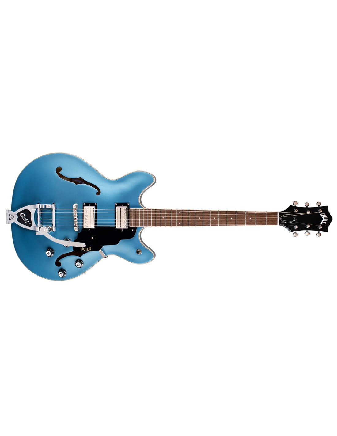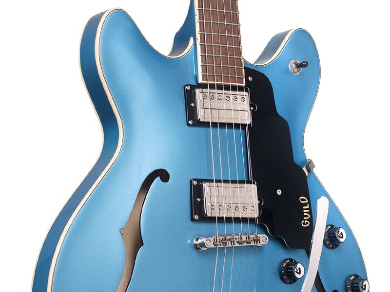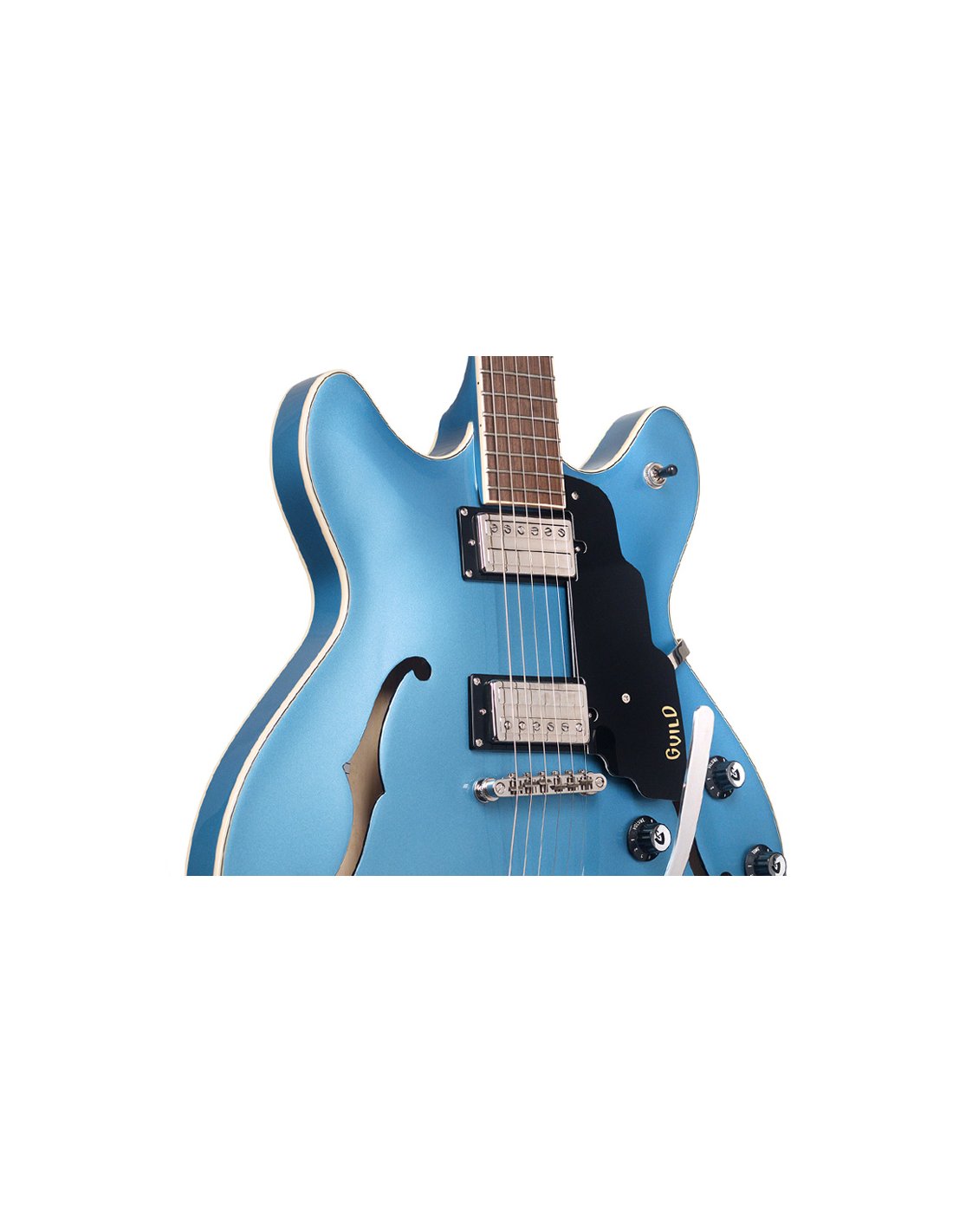 Inspired by the double cut shape made famous by the Starfire IV, V, and VI, the Starfire I DC features a semi-hollow body made with a central mahogany block to reduce feedback and have excellent sustain. Starfire I DC features an elegant arched top (with two F) in mahogany, as well as for the back and sides. The length of the scale is 24 3/4” (629 mm) the mahogany neck has a modern slim “U” profile for excellent playability. The Guild Vintage Premium Mechanics have a ratio of 18:1, the Tune-o-matic bridge with string attachment ensures easy tuning and great pitch hold. An injection of vintage sound is guaranteed by the Guild HB-2 Alnico II humbuckers, the push-pull allows you to split the pickup coils according to your needs. The bindings and purfling are in ABS, Pelham Blue glossy polyurethane finish.