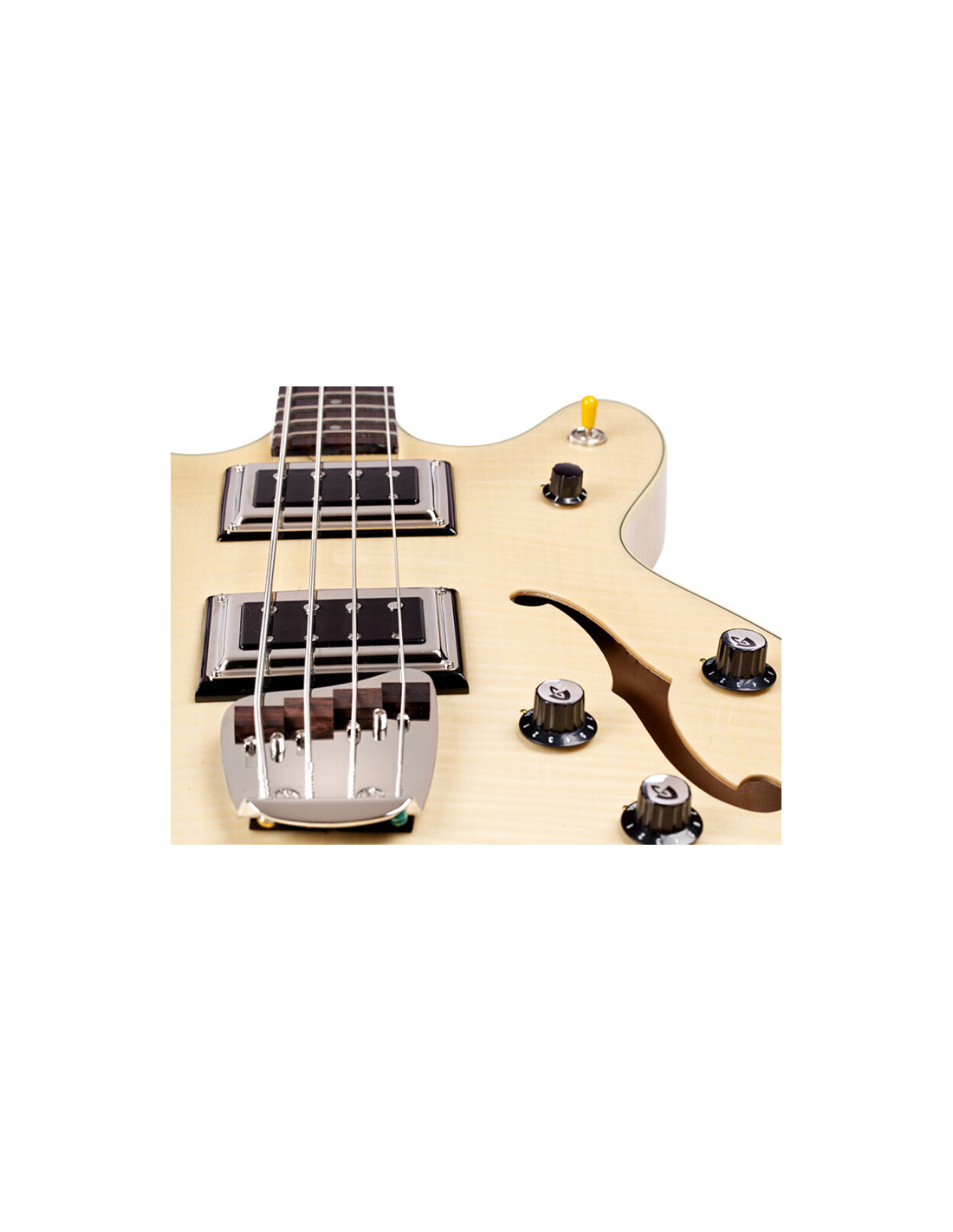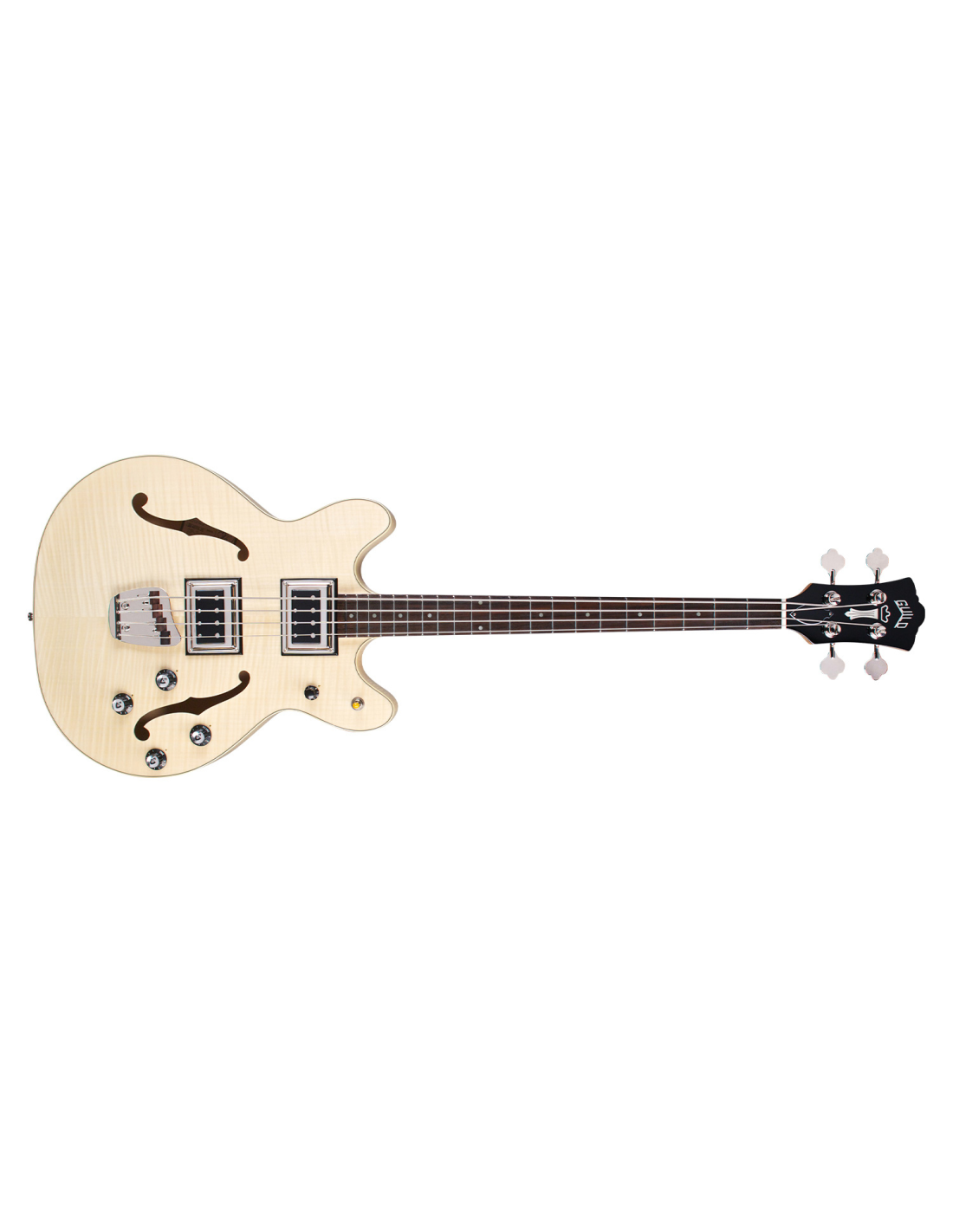 'Starfire Bass II is a bass with two semi-hollow pickups that adds important sound possibilities to one of the most iconic Guild models: the Starfire bass. The original Starfire Bass II debuted in 1967, soon after the single pickup version, and quickly found appreciation from musicians such as Jack Casady (Jefferson Airplane) and Phil Lesh (Grateful Dead). The addition of the Bisonic BS-1 pickup to the neck gives the instrument a warm and soft sound, for great versatility. This double cutaway bass has a top and bottom in arched flamed maple laminate (Arched), the neck is in three-piece maple with central walnut reinforcement with a “Soft U” profile, the nut is 38 mm and the instrument scale is 781 mm, the fingerboard is in rosewood with mother-of-pearl dot. Included are the Guild BS-1 dual pickups, with individual knobs for volume, tone, and master volume and a selection switch, the adjustable Guild bridge with rosewood or Ebony saddles while the mechanics are Grover 142 Vintage. A clear Natural glossy polyurethane high gloss finish adds to the beauty of this bass. Starfire Bass II offers the classic Guild vintage vibe sound to modern bassists. Includes the TKL hard case. '